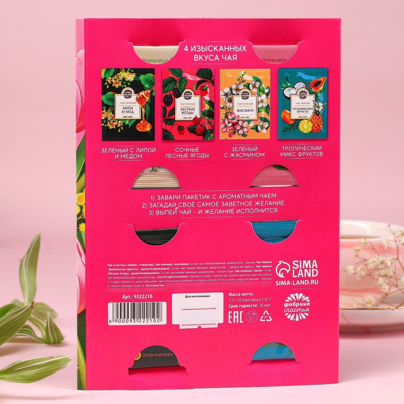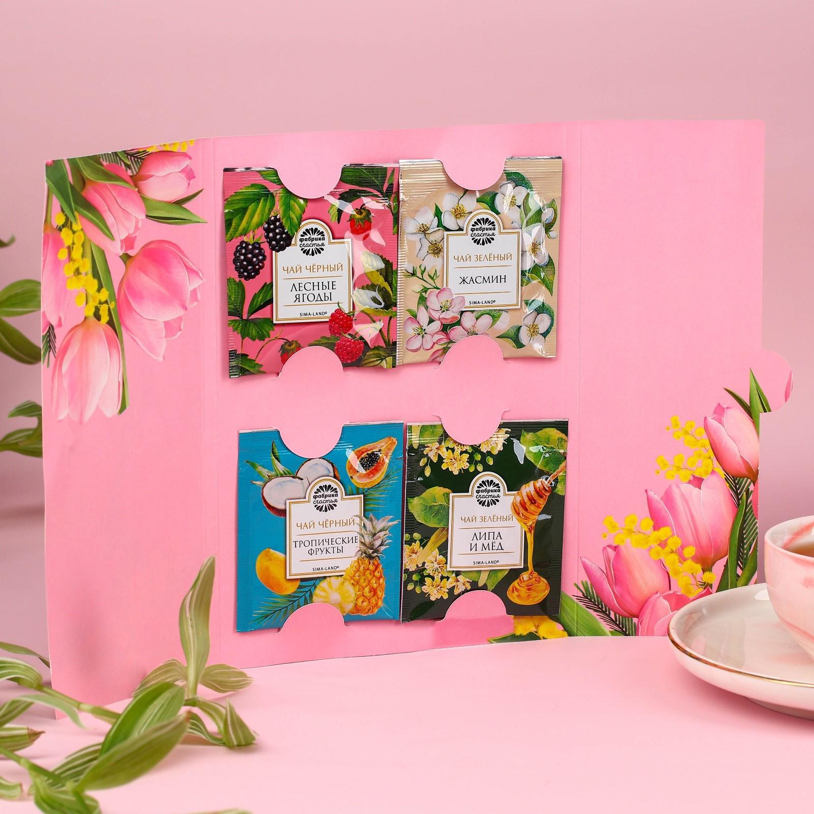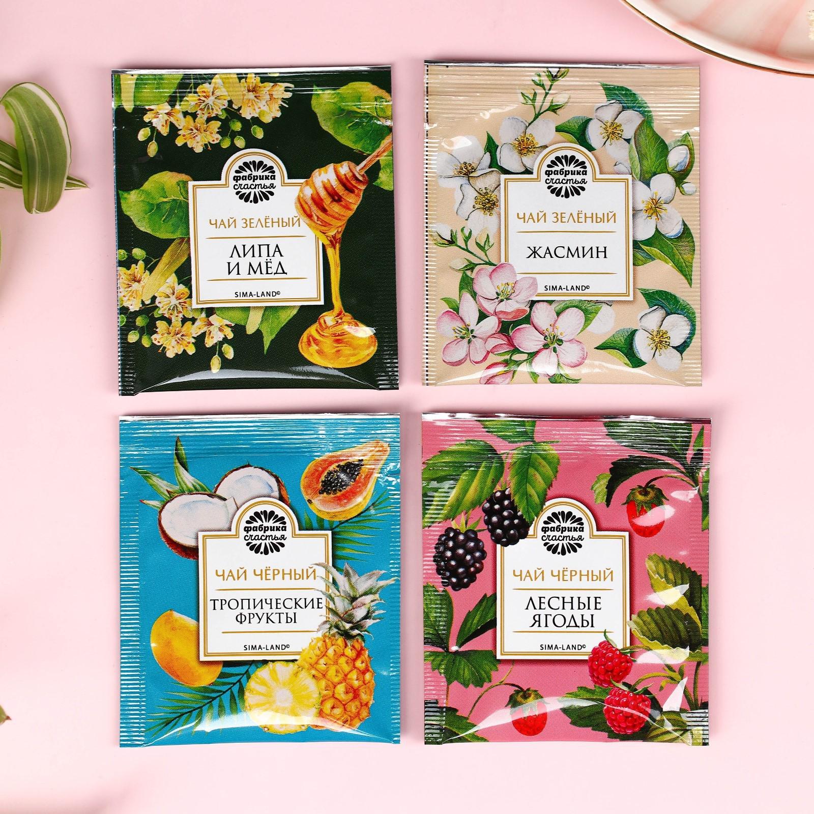Чай 4 пакетика «Счастья и любви»: чай зелёный: липа и мёд, жасмин, чай чёрный: тропические фрукты, лесные ягоды, 7,2 г.