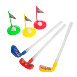 Чтобы малютке было легко довести мяч до цели, в комплект входят 3 разнообразные клюшки: одна для ввода мяча в игру, другая для прохождения коротких дистанций и третья пригодится для выбивания мяча из песка или травы.