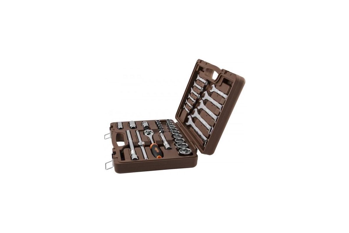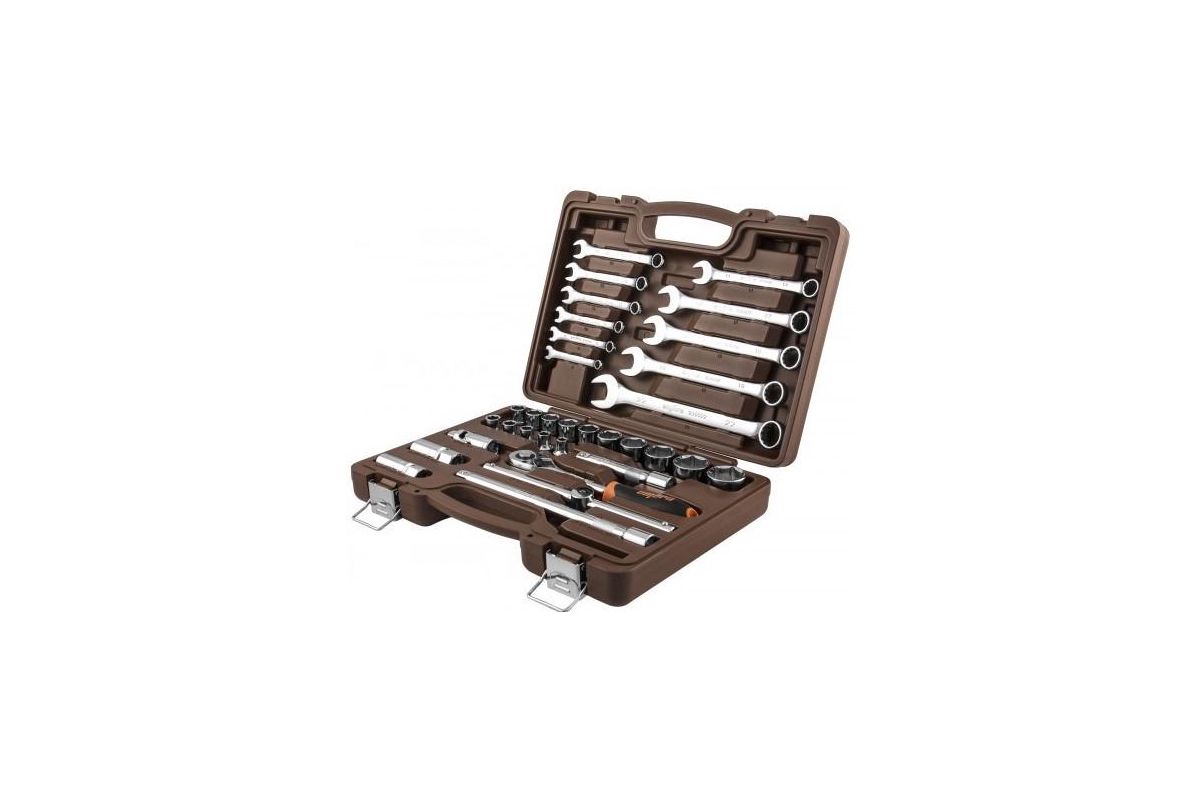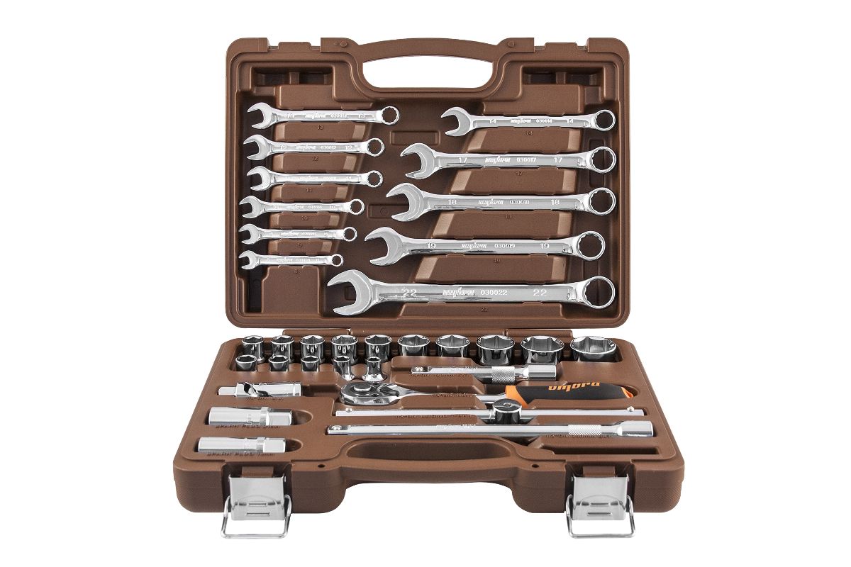OMT33S Универсальный набор инструмента торцевые головки 1/2''DR, 8-32 мм и аксессуары к ним, комбинированные ключи 8-22 мм, 33 предмета.Содержание: Головка торцевая 16 шт. 6, 7, 8, 9, 10, 11, 12, 13, 14, 15, 16, 17, 18, 19, 21, 22 мм.