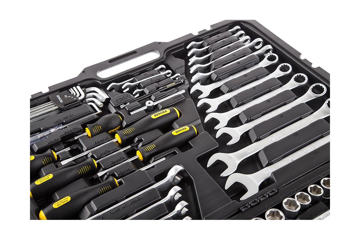 BERGER BG141-1214 – универсальный набор инструментов для профессионального использования. Подойдет как для гаража, так и для профессиональной автослесарной мастерской. Выполнен из легированной хромованадиевой стали с защитой от коррозий и деформаций. В наборе 141 предмет.
