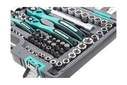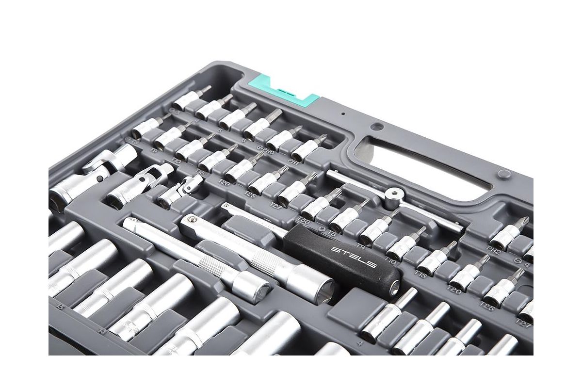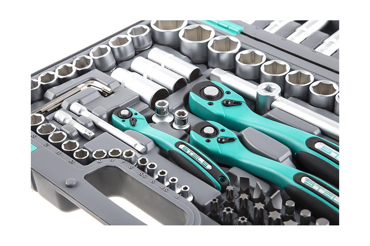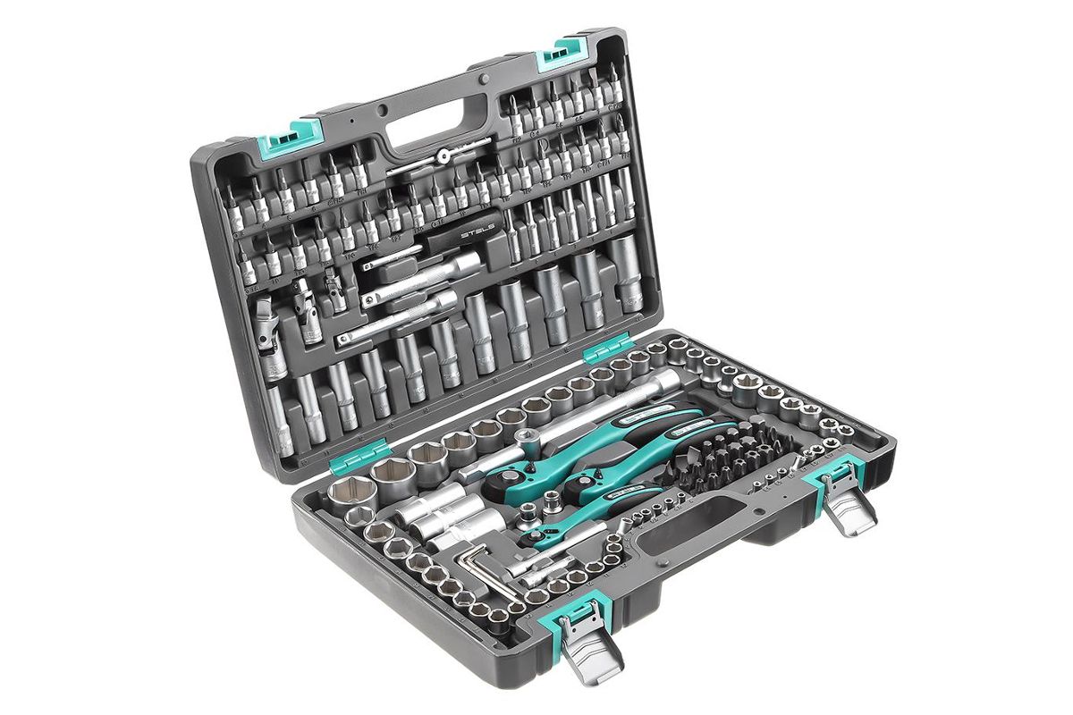 Набор инструментов STELS 14114 пригодится автолюбителям, мастерам СТО, на даче или при ремонте бытовой техники. 151 предмет упакован в усиленный кейс. Вес набора – 8,82 кг. За широкую ручку на кейсе его удобно перевозить или переносить по территории.