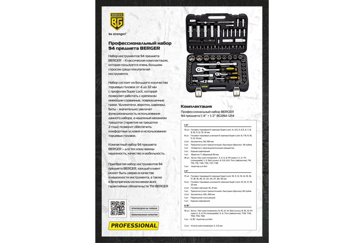 Универсальный набор инструментов BERGER BG094-1214 состоит из 94 предметов. Пригодится для обслуживания и ремонта автомобиля. Инструмент выполнен из хромованадиевой стали. Благодаря особой технологии гальванизации и закаливания он выдерживает высокие нагрузки и может использоваться в профессиональных целях.