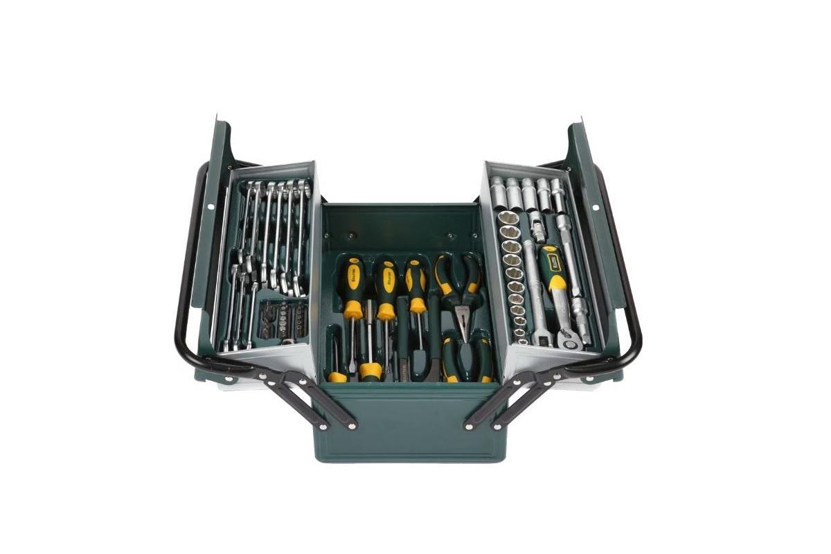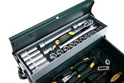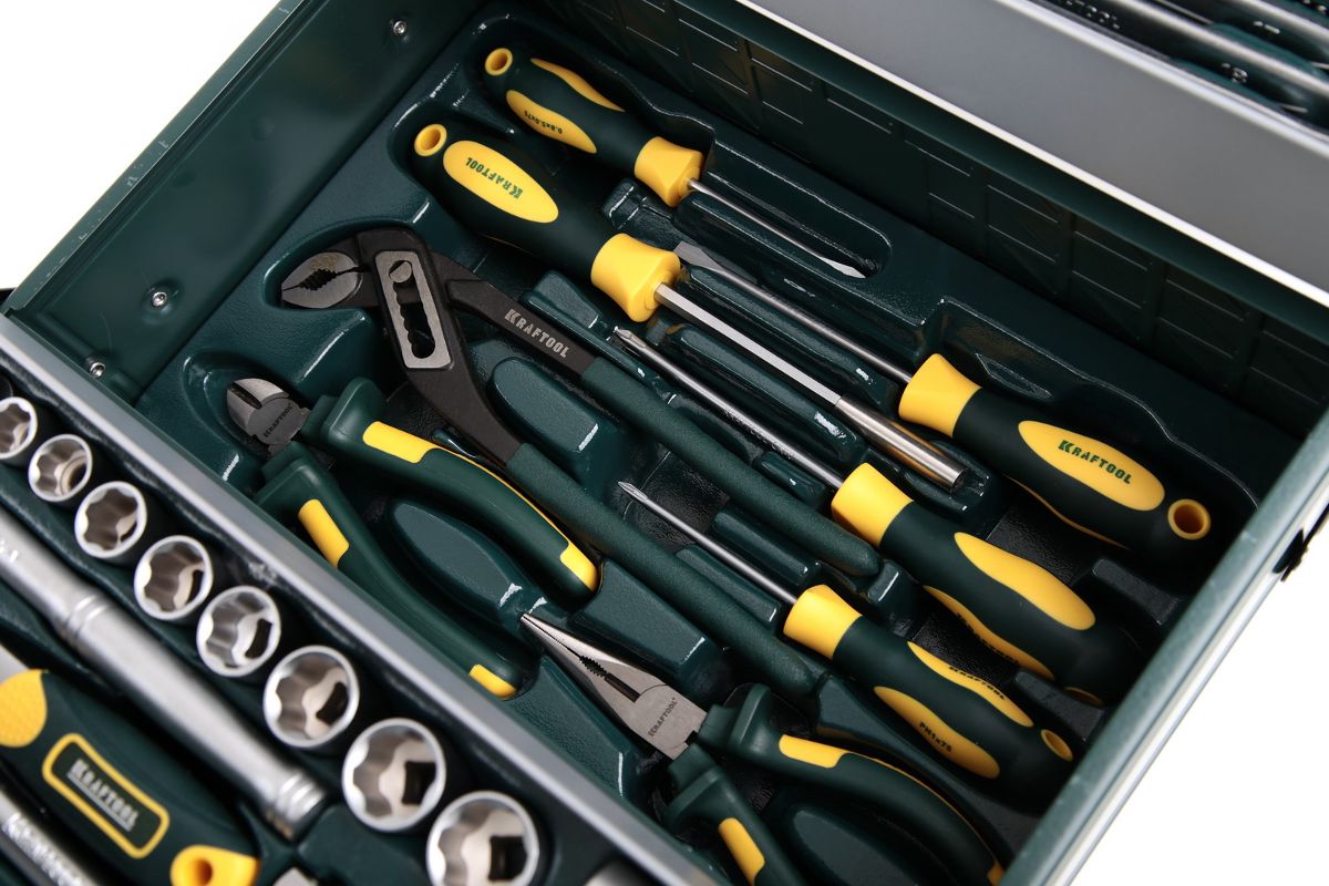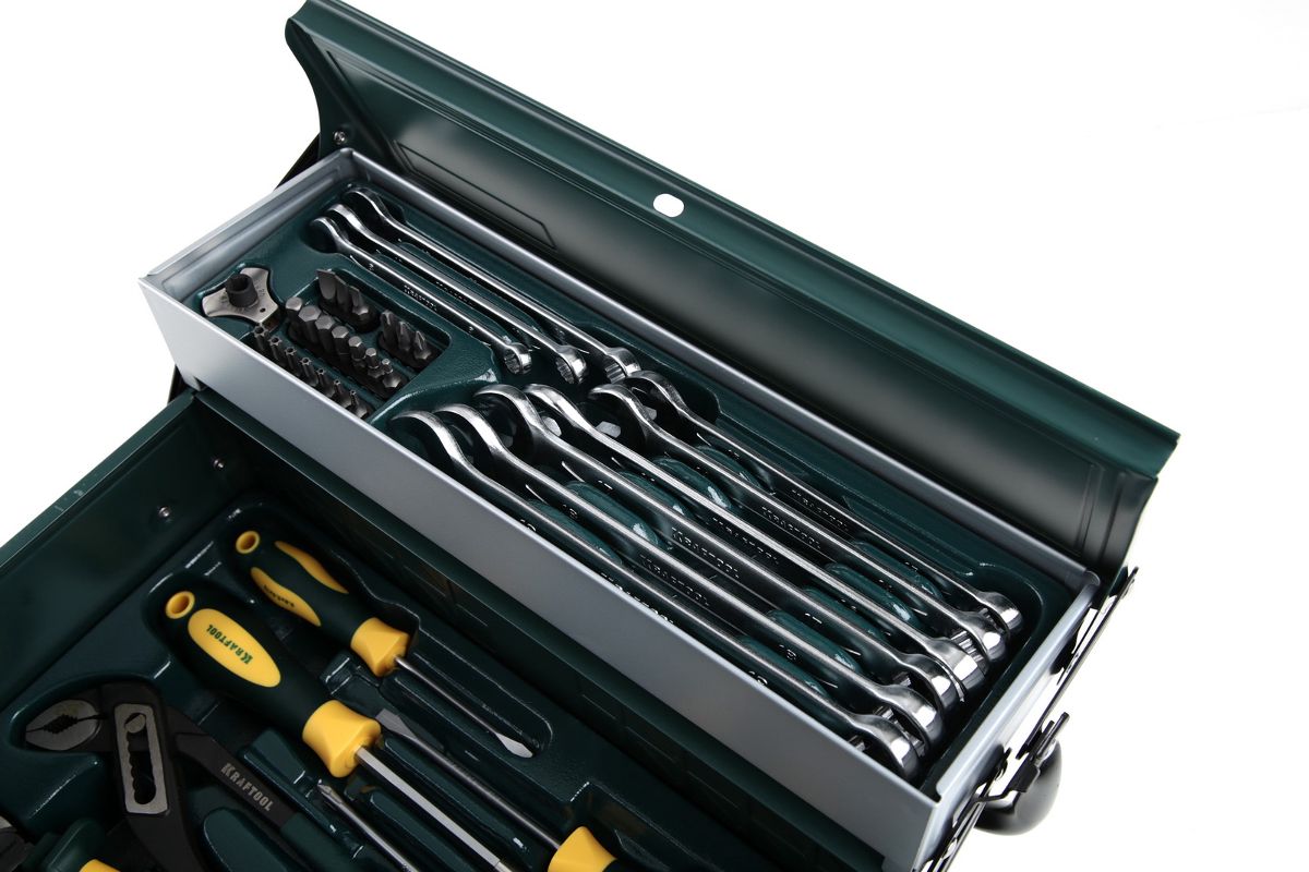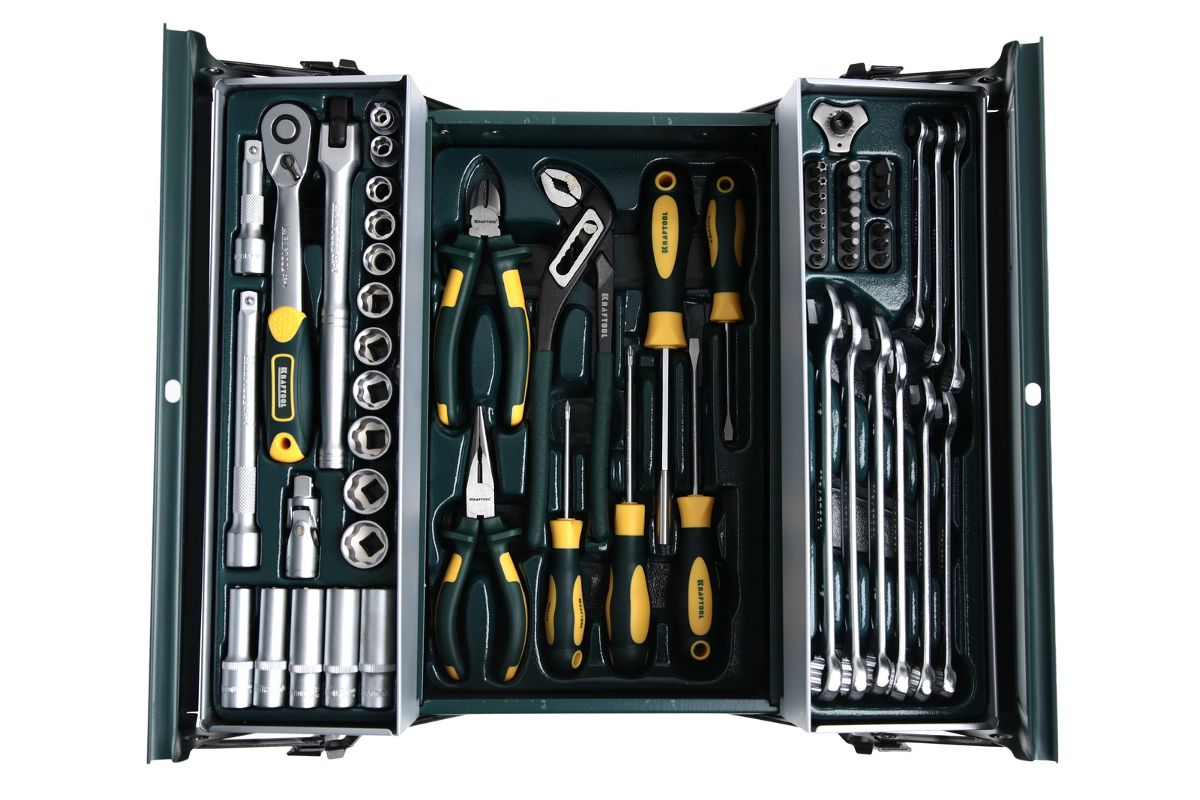 KRAFTOOL 27978-H59 – набор слесарно-монтажных инструментов, который можно рекомендовать и домашнему мастеру, и профи. Состоит из 59 предметов, в первую очередь — торцевых и свечных головок, отверточных бит, комбинированных ключей. Подойдет для электромонтажных и авторемонтных работ. Набор поставляется в удобном раскладном ящике. Полный вес – 7,7 кг.