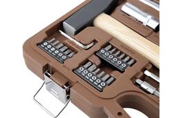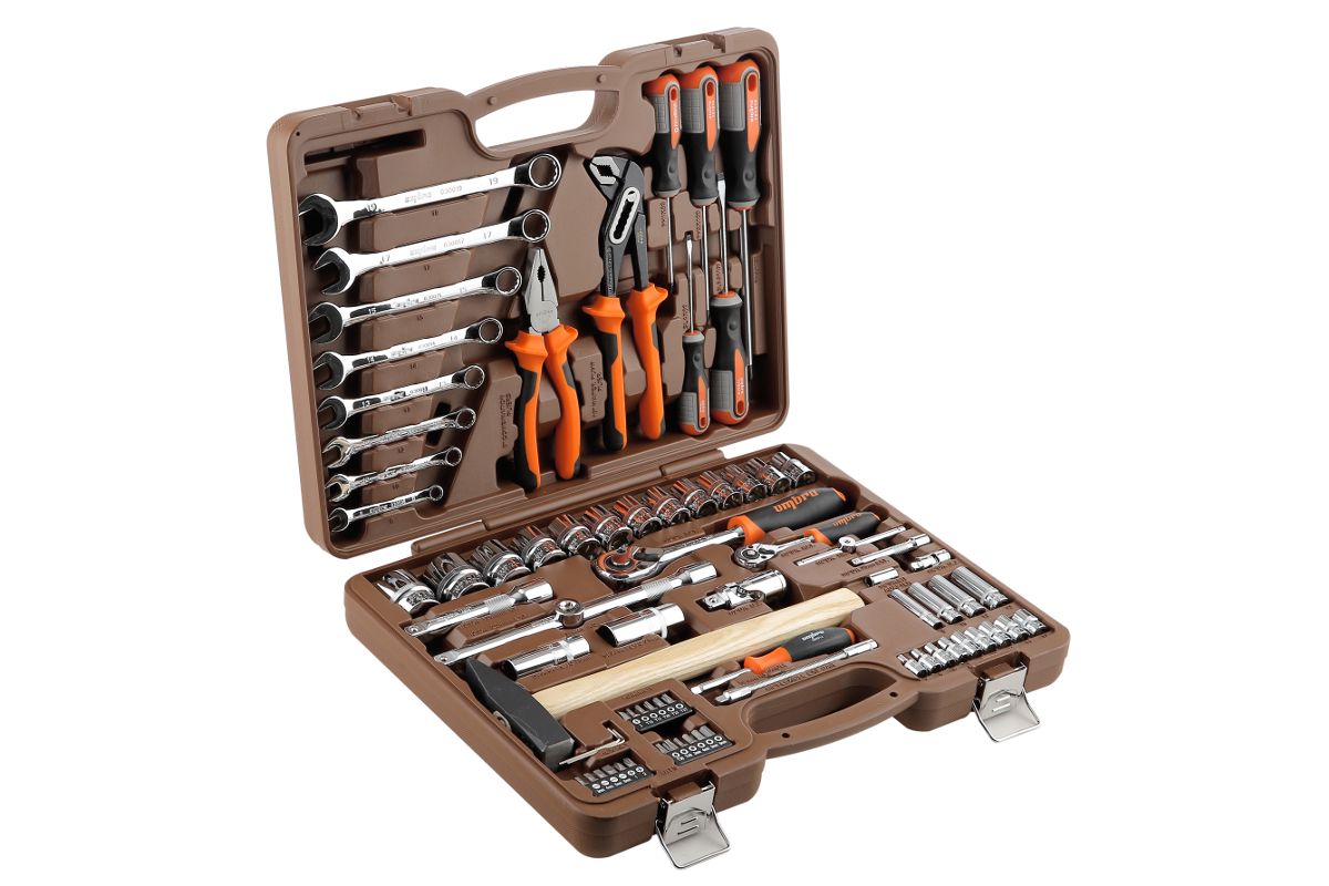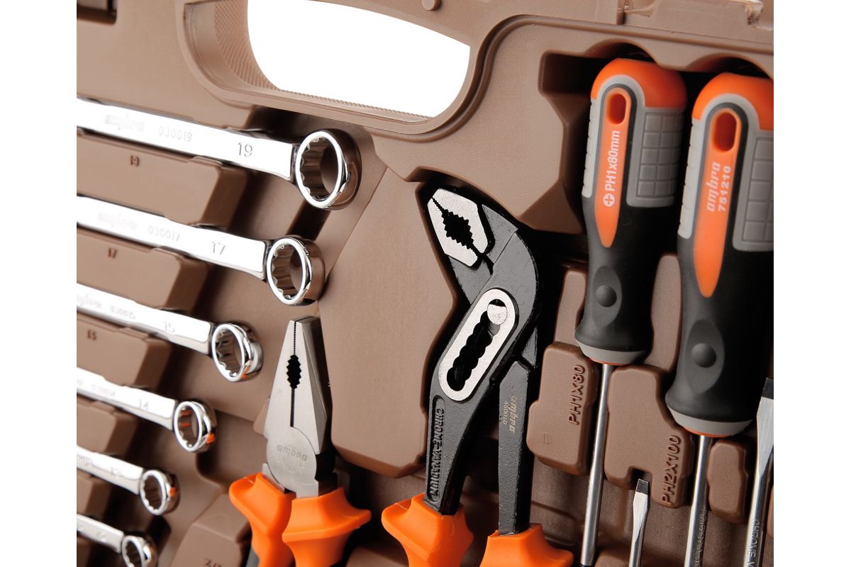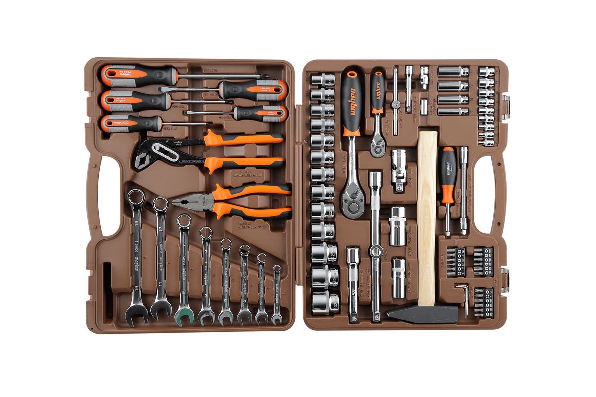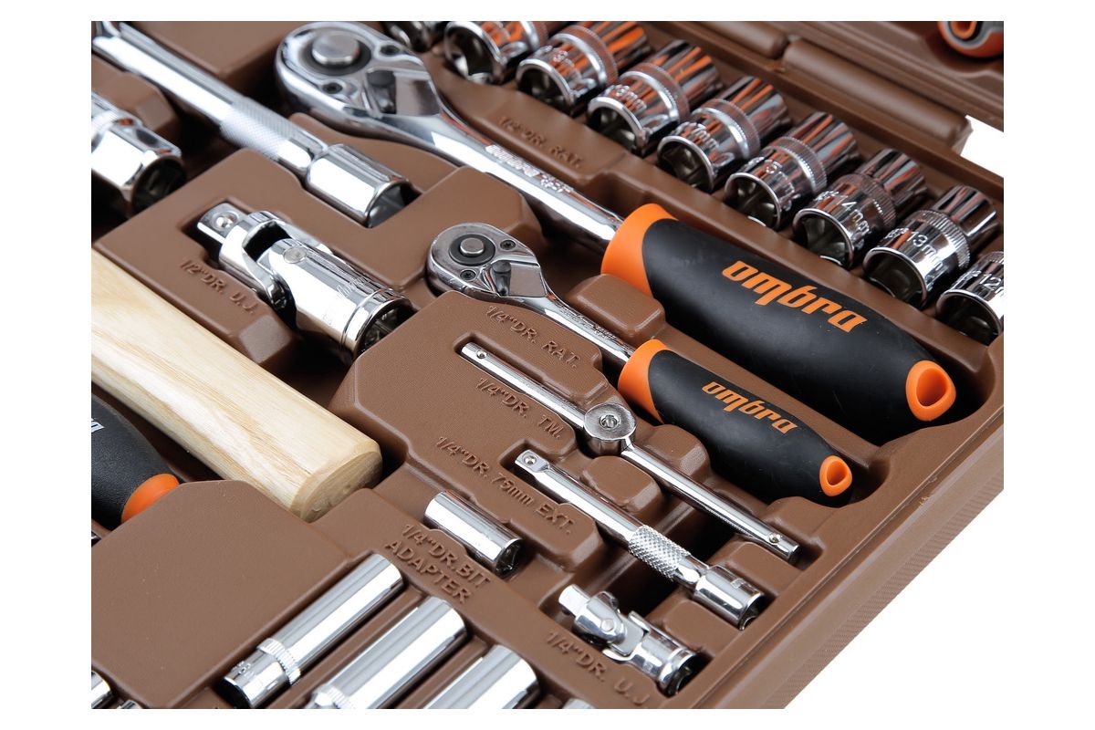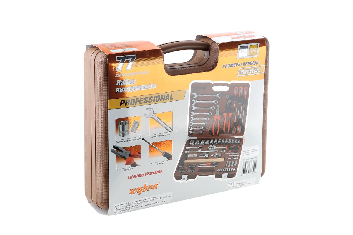 OMBRA OMT77S12 – универсальный набор инструментов для ремонтно-сборочных работ. Рекомендован для автомастерских. В комплект входит 77 предметов. Эргономичные двухкомпонентные рукоятки хорошо лежат в руке. Упаковка – кейс. В транспортировочном кейсе предусмотрены отдельные ячейки для каждого приспособления. Вес набора – 6 кг.
