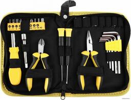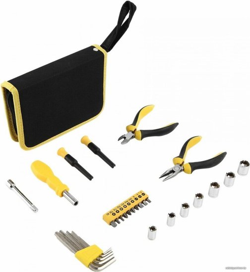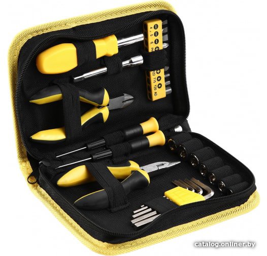 - Комплектация - Шестигранный ключ - 5 шт.;- Отвертки - 2 шт.;- Отвёртка с набором бит (10 шт.);- Адаптер-удлинитель;- Головки - 7 шт;- Бокорезы;- Тонконосы;- Нейлоновая сумка.