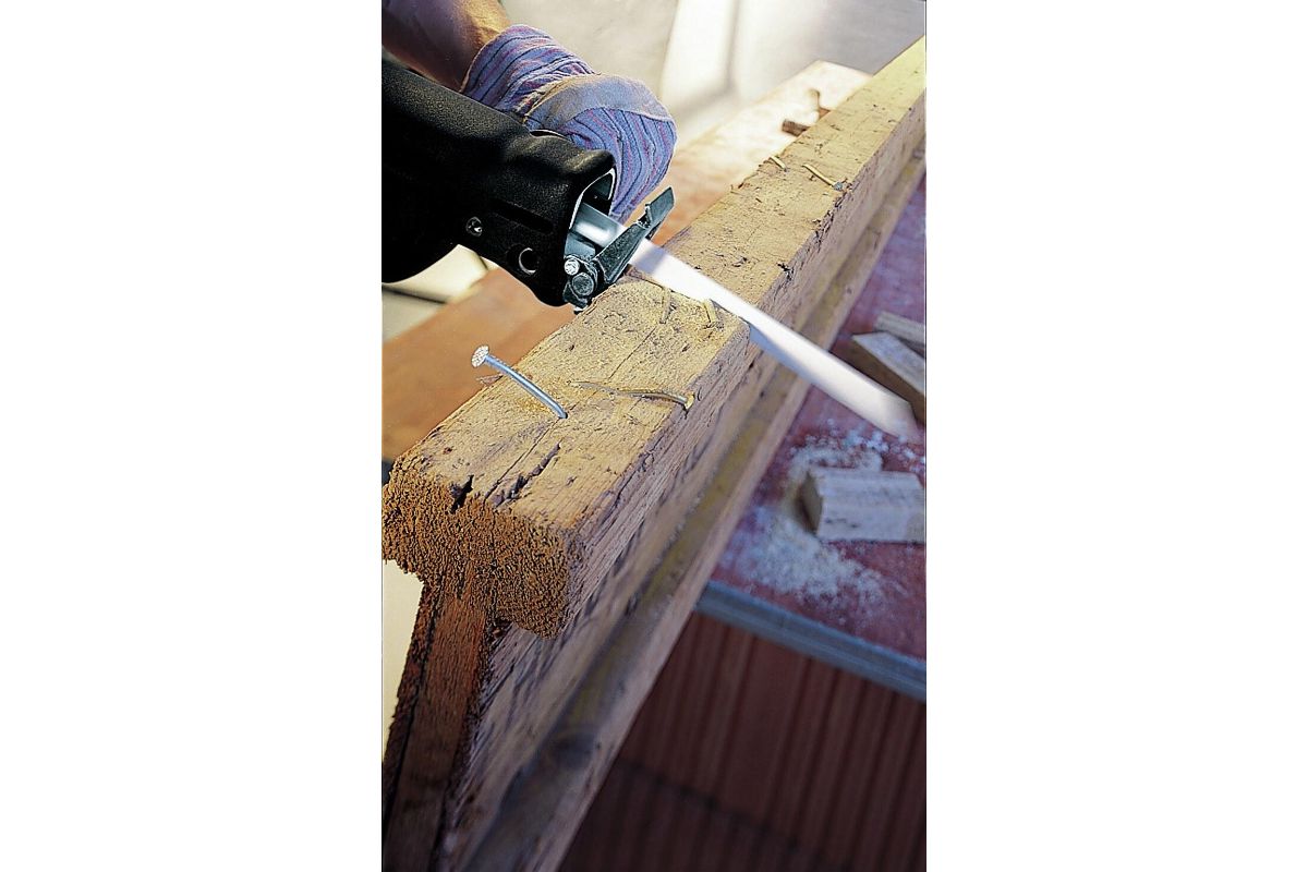 BIM (биметаллическая) полотно состоит из HCS (высокоуглеродистая сталь) и полоски зубьев HSS (быстрорежущая сталь), что делает это сабельное пильное полотно оптимальным для ремонта паллет.
