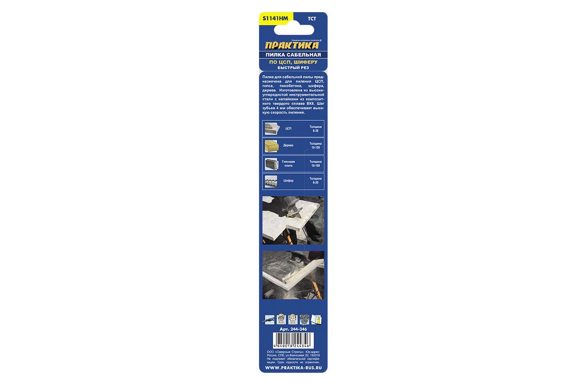 Пилка для лезвийной (сабельной) пилы Практика 244-346 тип S1141HM предназначена для пиления минеральных материалов: газо-пенобетона до 180 мм, силикатного кирпича, ЦСП, шифера; дерева, толстого ДСП, пакетов материалов; имеет узкое удлиненное полотно с напайками из карбида вольфрама ВК8. Обеспечивает высокую скорость пиления. Длина общая/рабочая 225/200мм, шаг зубов 4,0мм, ширина пропила >2,0 мм. 1шт. Серия ''Эксперт''.