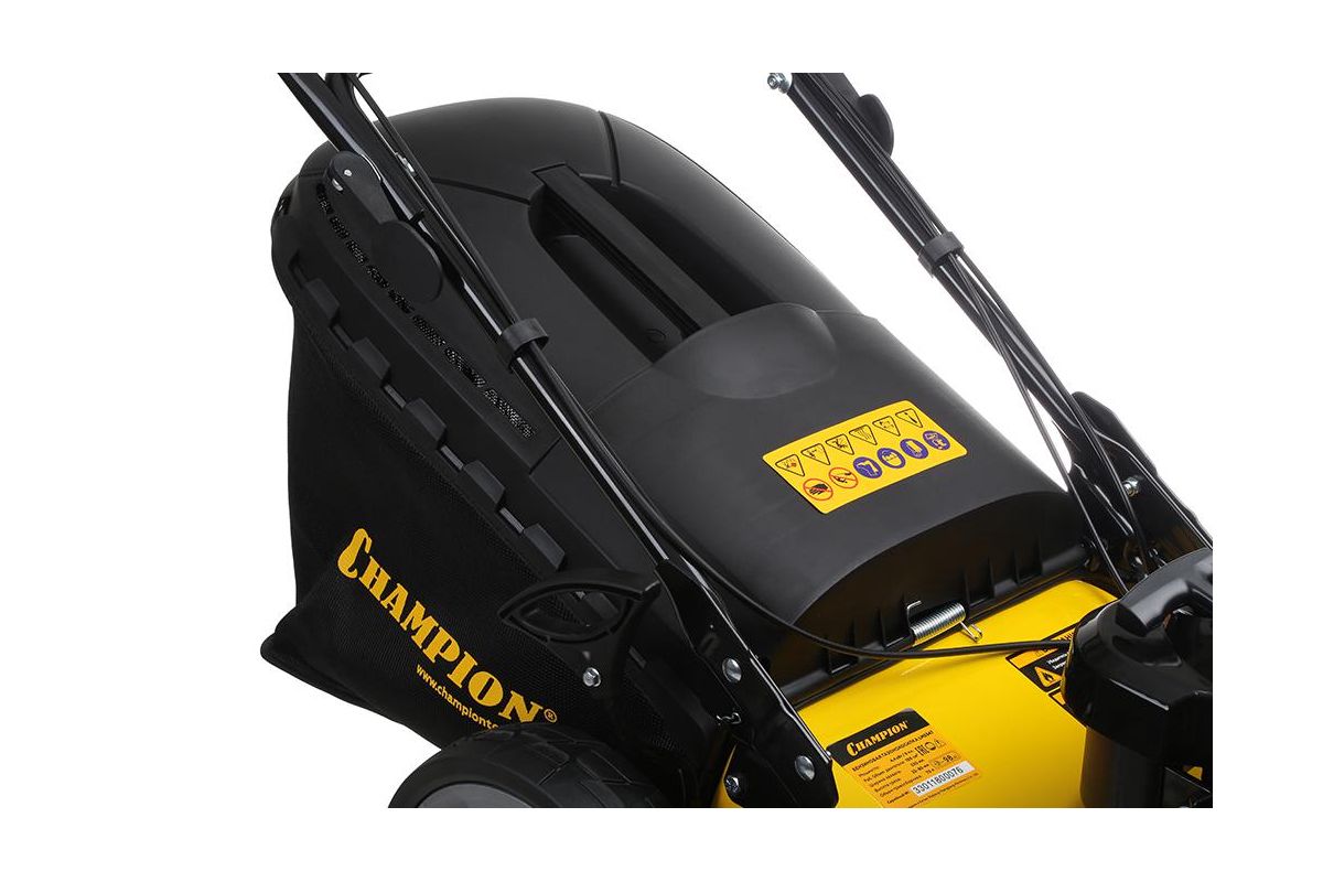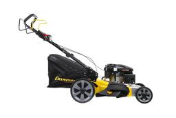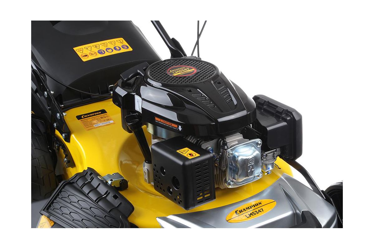 CHAMPION LM5347 – самоходная бензиновая газонокосилка с четырёхтактным двигателем. Справляется с молодой газонной травой и высокими толстыми стеблями. За один проход скашивает тропинку шириной 53 см. Объём травосборника – 70 л.