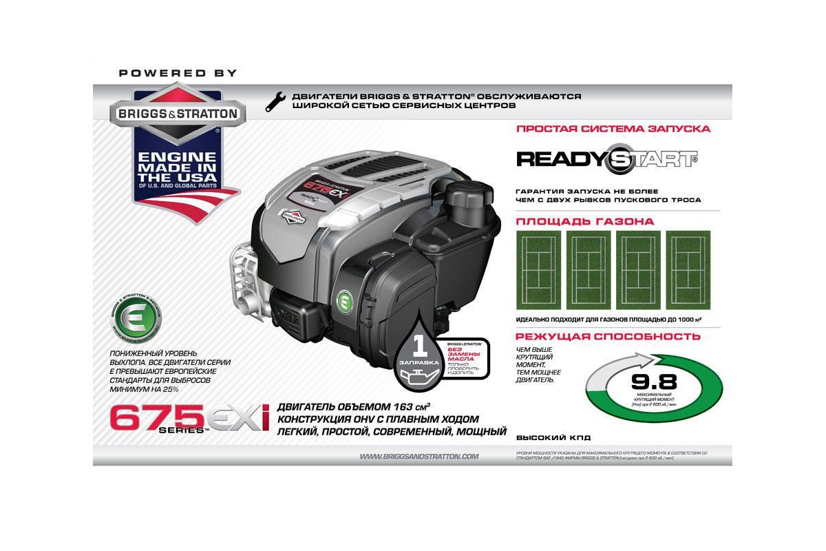 Предусмотрена система регулировки высоты скашивания с семипозиционной установкой в диапазоне от 19 до 76 миллиметров. Высота скашивания устанавливается при помощи одного рычага.