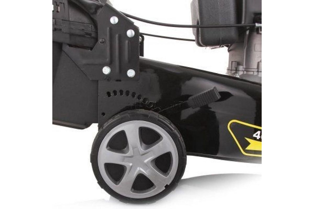 Бензиновая газонокосилка, мощность 3.5 л.с. несамоходная, скорость оборотов холостого хода 2200 об/мин, объем топливного бака 1 л, высота среза 25-75 мм,ширина среза 420 мм,регулировка высоты среза центральная, 7 уровней, объем травосборника 45 л, тканевый.
