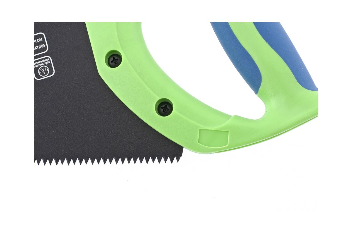 Ножовка по дереву Сибртех «Зубец» 23809 с полотном длиной 350 мм, калеными зубьями с 2D-заточкой и шагом 7-8 TPI, защитным покрытием и 2-компонентной рукояткой, используется для распиливания заготовок из древесины, фанеры и ДСП. Выполняет продольный и поперечный распил. Заточка зубьев 2D дает возможность пилить по направлению как вперед, так и назад. Зубья с универсальным шагом 7-8 TPI обеспечивают оптимальную скорость и качество реза. Если режущая кромка затупится, ее можно будет заточить. Ножовка будет полезна в столярной мастерской, а также дома или на даче.