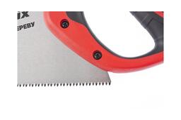 Ножовка изготовлена из холоднокатаной стали марки 65 Mn с твердостью закаленного зуба 50–65 HRс. Трехгранная лазерная заточка зубьев. Количество зубьев на дюйм – 7 (универсальный шаг). Обрезиненная эргономичная рукоятка улучшенного дизайна. Применяется при работах с древесиной различных видов.