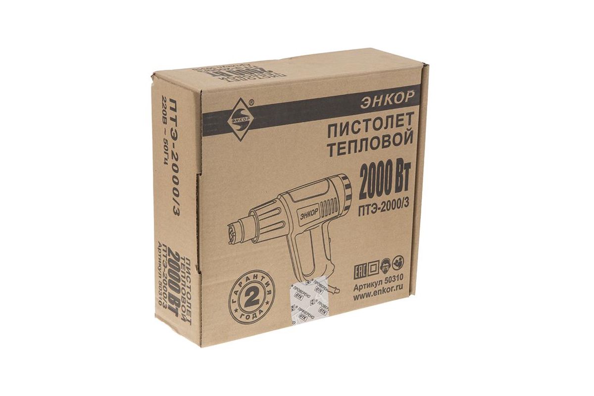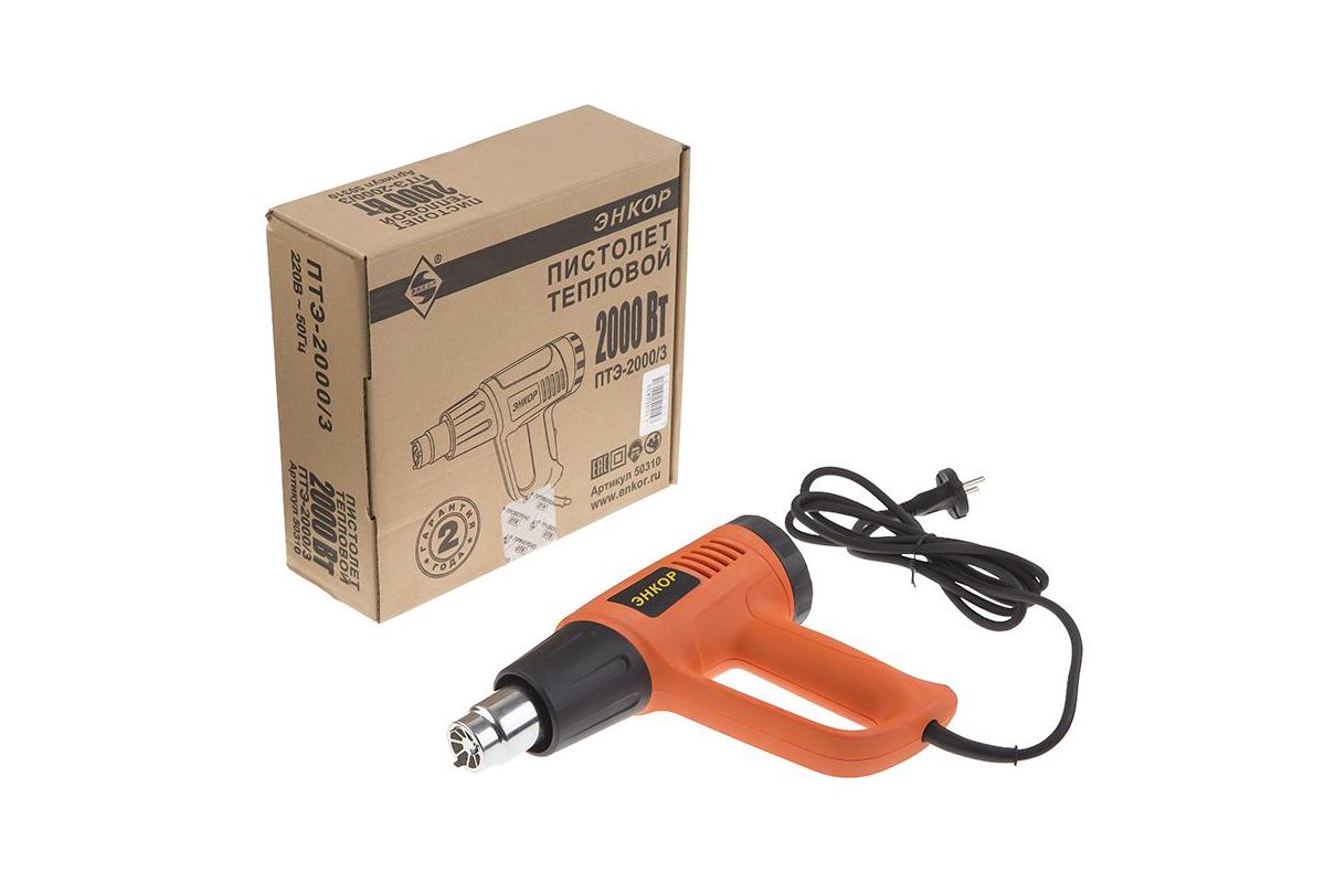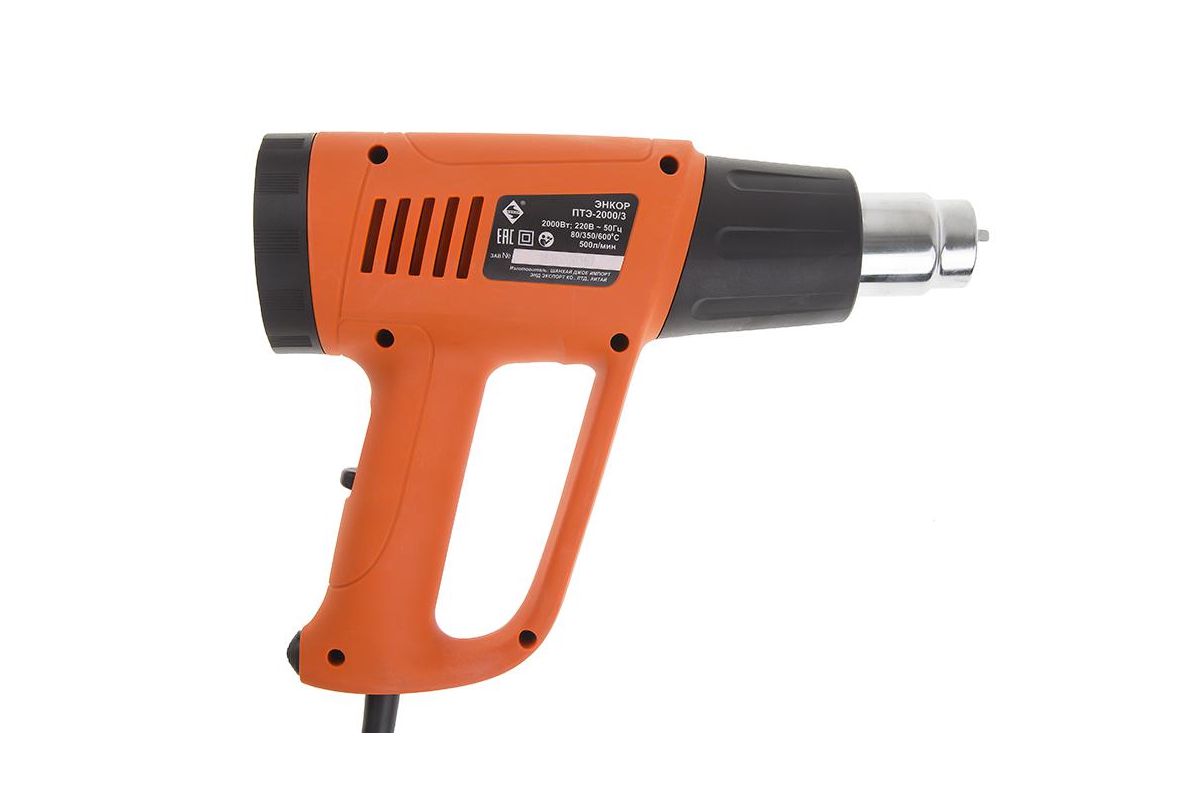 ЭНКОР ПТЭ-2000/3 тепловой пистолет с мощностью 2000 Вт. Подходит для быстрой сушки краски, лаков или клеев; для удаления обоев и ЛКП; для размораживания труб; для формования и сварки изделий из ПВХ и т.д. Минимальная температура – 80°C, максимальная – 600°C.