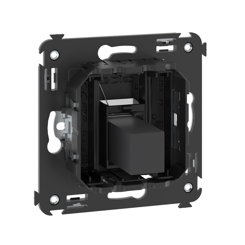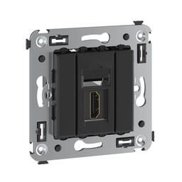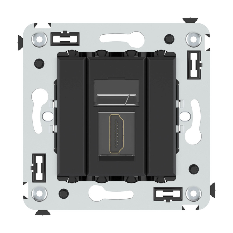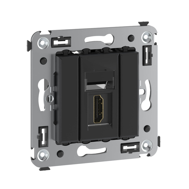 HDMI-розетка. Назначение: для монтажа в подрозеточные коробки глубиной не менее 45 мм (код 59301). Используется в качестве мультимедийной розетки для передачи сигнала (подключение проекторов, мониторов, телевизоров и др.). Характеристики: 1 модуль, с пылезащитной шторкой; с маркировочной табличкой; в комплекте разъем Keystone; для заделки контактов используется инструмент типа 110; тип розетки А-А или мама-мама. Фиксация производится в подрозеточные коробки глубиной не менее 45 мм при помощи каркаса с лапками (код 4400802) и саморезов. Цвет: Черный матовый.