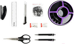 • Наполнение ручка (автоматическая шариковая), карандаш (механический), ластик, линейка, степлер, скрепки, ножницы, нож канцелярский, скобы (для степлера)