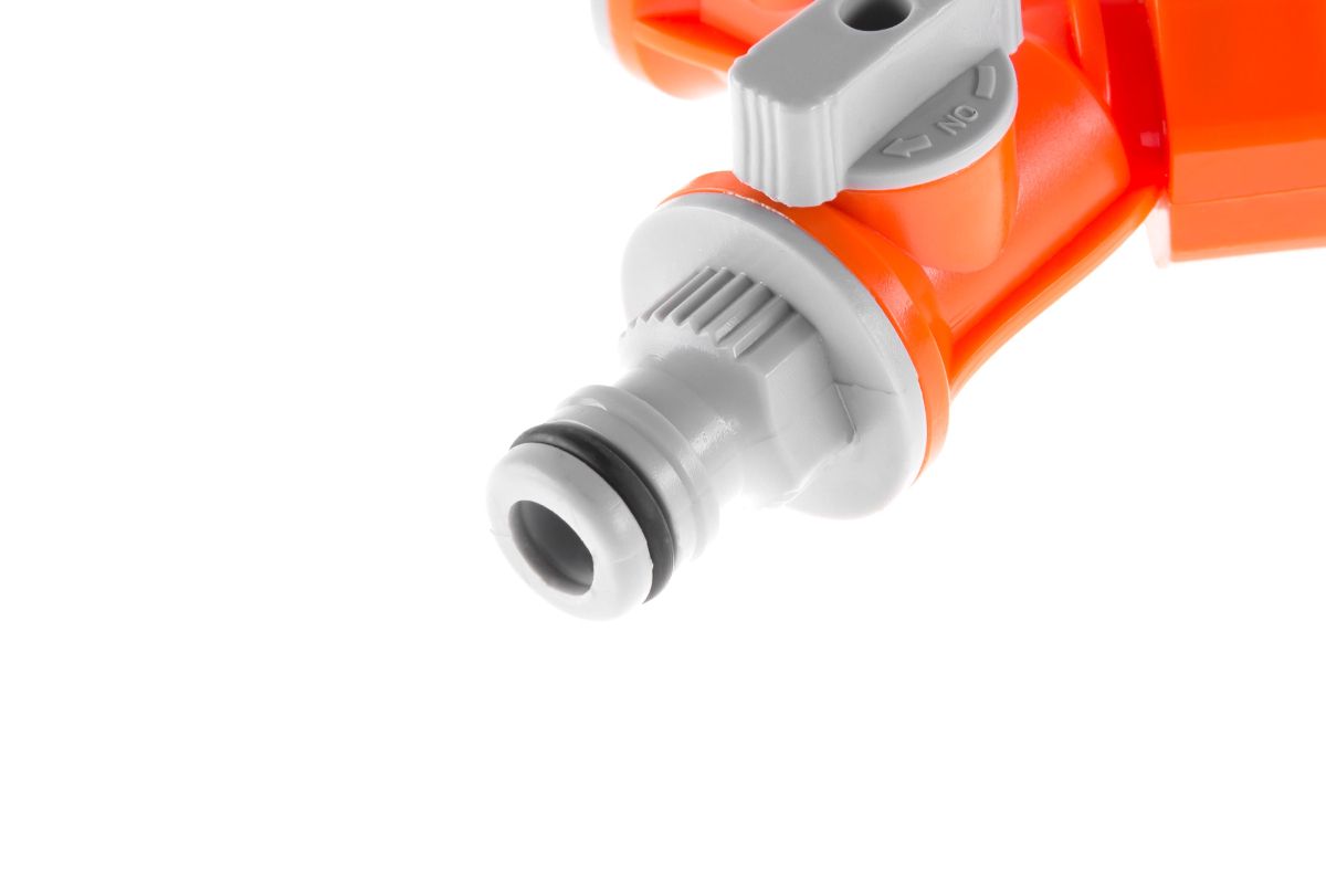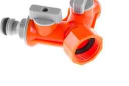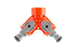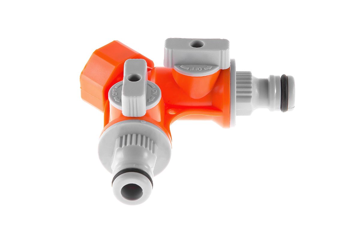 Соединитель двухканальный является составной частью системы полива и предназначен для разветвления подачи воды в кране при орошении растений. Соединяется с водопроводным краном внутренней резьбой G3/4''. Специальные вентили позволяют регулировать подачу воды по тому или иному каналу. Распределитель выполнен из высокопрочного материала, что гарантирует длительный срок эксплуатации.