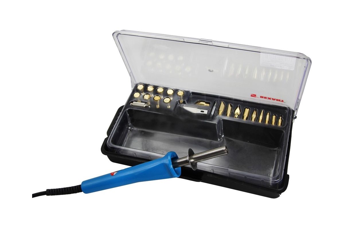 Набор паяльник-выжигатель ZD-972A ПРОФИ (19 насадок) 220V/30 Вт REXANT – отличное решение для тех, кто стремится по максимуму использовать полезные приборы. Суть работы паяльников и выжигателей по дереву очень схожа, на этом и основано действие прибора. Благодаря 19 различным насадкам его можно сделать как паяльником, так и выжигателем. С помощью этих насадок можно создавать красивые картины, выжигая на дереве различные узоры, выполнять выжигание на коже или резать пластмассу. Все насадки закрепляются с помощью винта. Также в комплекте есть подставка. Потребляемая мощность инструмента 30 Вт. Для удобства пользования и транспортировки набор поставляется в пластиковом боксе.