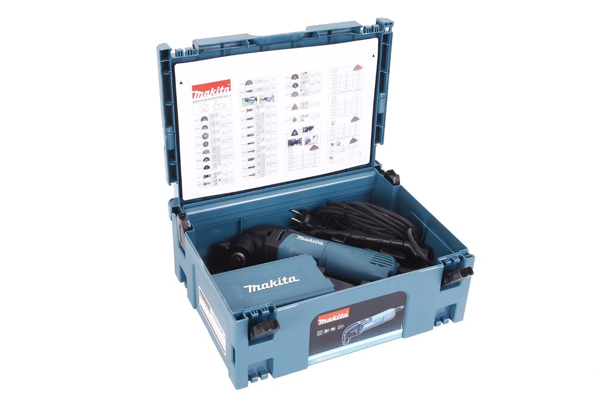 MAKITA TM3000C(X3J) — эргономичный многофункциональный инструмент с набором оснастки. Используется для выполнения разноплановых задач. С помощью входящих в комплект насадок инструмент вырезает отверстия, пилит заготовки, шлифует, зачищает поверхности. Скорость работы — 6000-20000 об/мин. Угол колебания — 1.6°. Поставляется в кейсе.
