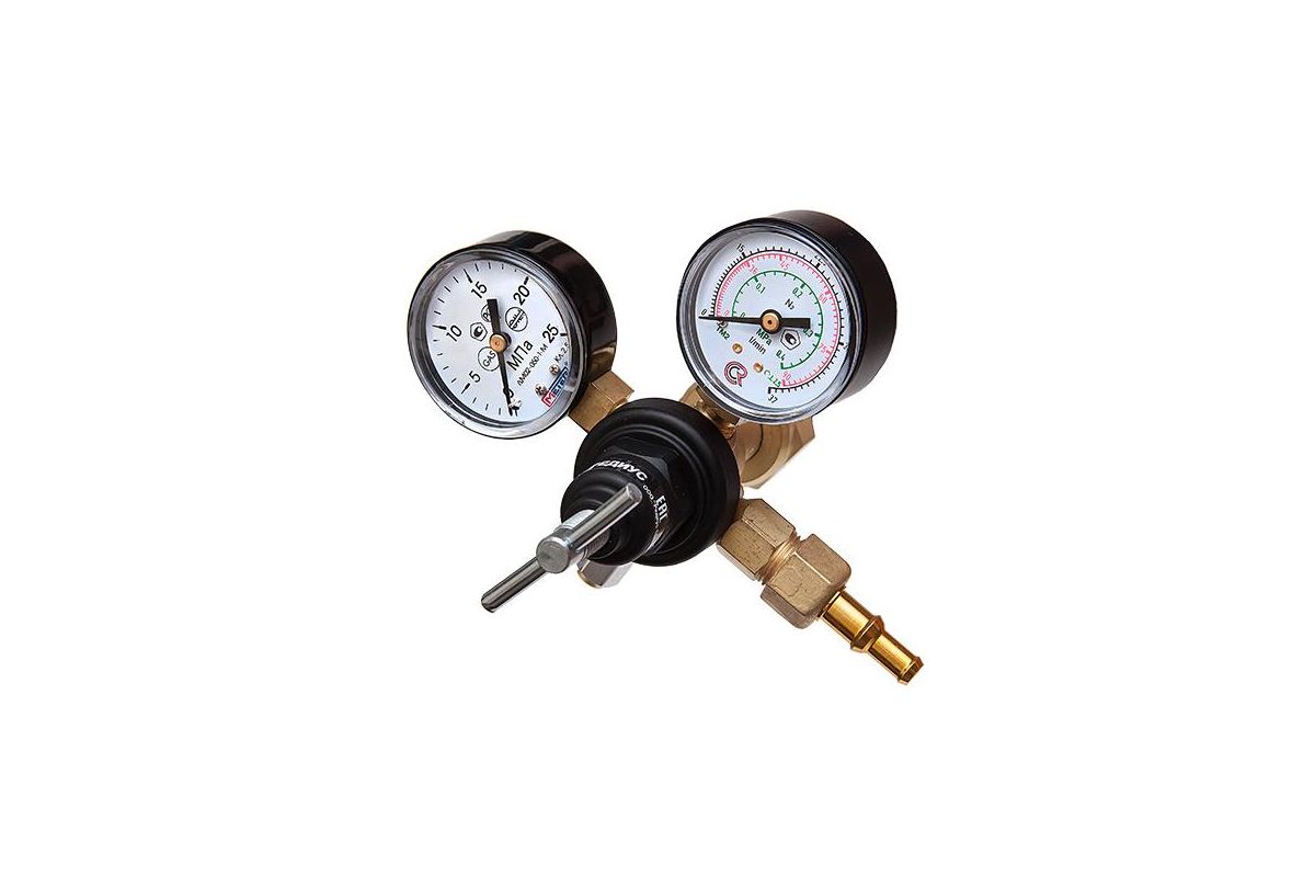 Малогабаритный азотный регулятор выполнен по осевой схеме, за счет чего обладает компактными размерами при сохранении всех рабочих параметров на уровне крупногабаритных регуляторов. Регулятор предназначен для понижения и регулирования давления азота, поступающего из баллона, и автоматического поддержания постоянного рабочего расхода газа на выходе регулятора в ходе проведения работ. Регулятор имеет манометр высокого давления и манометр низкого давления показывающий расход.