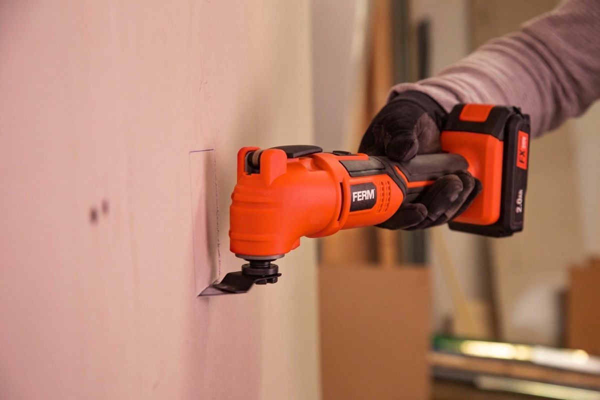 Аккумуляторный реноватор FERM OTM1012 - универсальный многофункциональный инструмент для резки гипсокартона, металла, дерева, пластика, композитных и прочих материалов. Также используется для чистой шлифовки. Удобный корпус с обрезиненными рукоятками обеспечивает надежный хват, и прибор не выскальзывает во время работы.