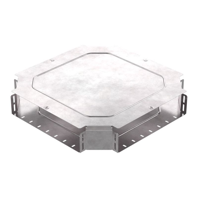 Ответвитель X-образный предназначен для разветвления кабельных трасс в горизонтальном направлении, для перфорированных и глухих лотков. В комплект входит крышка.