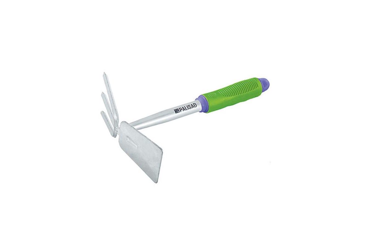 Мотыжка комбинированная, профиль ''трапеция'' и три зубца, с обрезиненной рукояткой, которую при необходимости можно удлинить. Ширина рабочей части 65 мм, общая длина 290 мм.