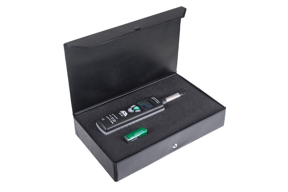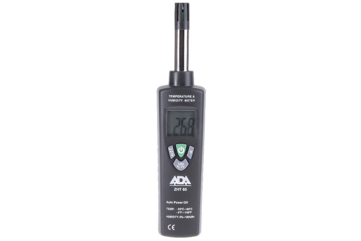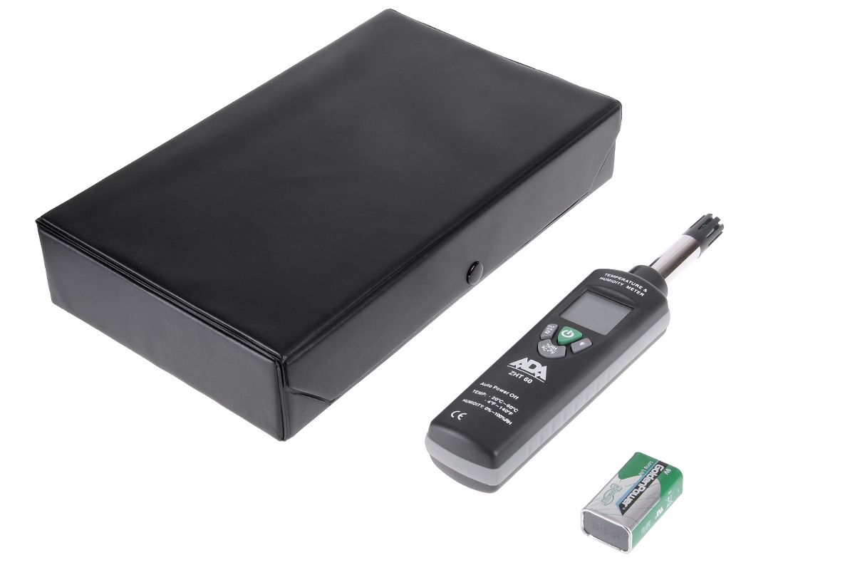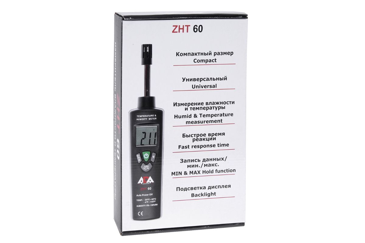 Детектор ZHT 60 для измерения влажности и температуры использует датчик влажности/полупроводниковый датчик. ZHT 60 позволяет: измерять относительную влажность в диапазоне от 0% до 100% с разрешением 0.1%, измерять температуру в диапазоне от 0 °С до 60 °С с разрешением 0.1 С, сохранять данные, минимальное и максимальное значения. Измеритель влажности имеет подсветку дисплея и компактный размер.