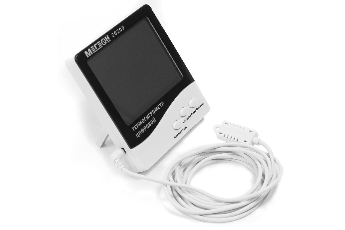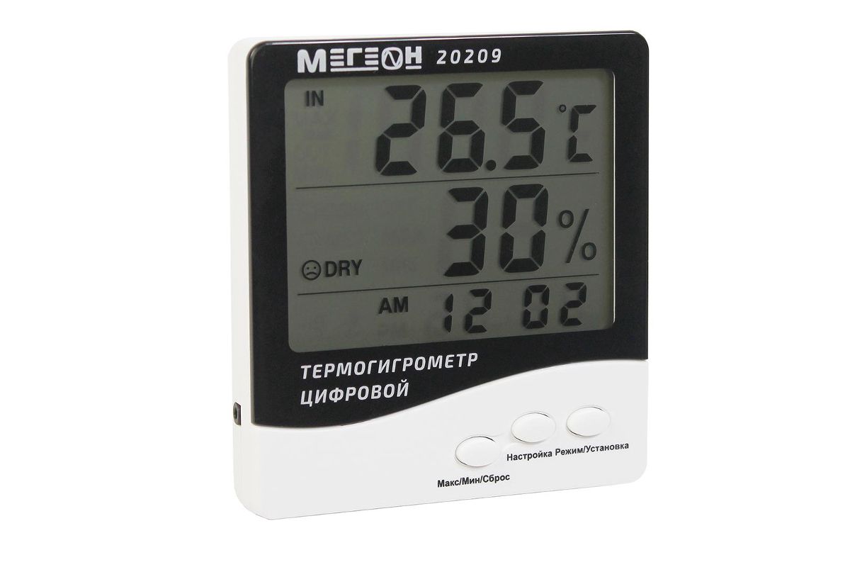 Цифровой термогигрометр МЕГЕОН 20209 представляет собой двухзонный электронный термометр совмещенный с цифровым гигрометром. Прибор оснащен большим высококонтрастным жидкокристаллическим дисплеем, на котором одновременно отображаются температура, влажность и текущее время, а использование современной элементной базы позволило достичь высокой точности измерений температуры и влажности.