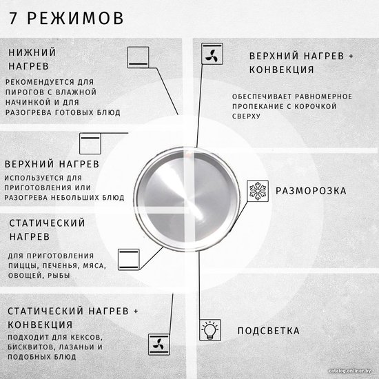 • Режимы работы нижний нагрев, верхний нагрев, двухсторонний нагрев, двухсторонний нагрев + конвекция, размораживание