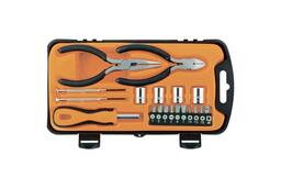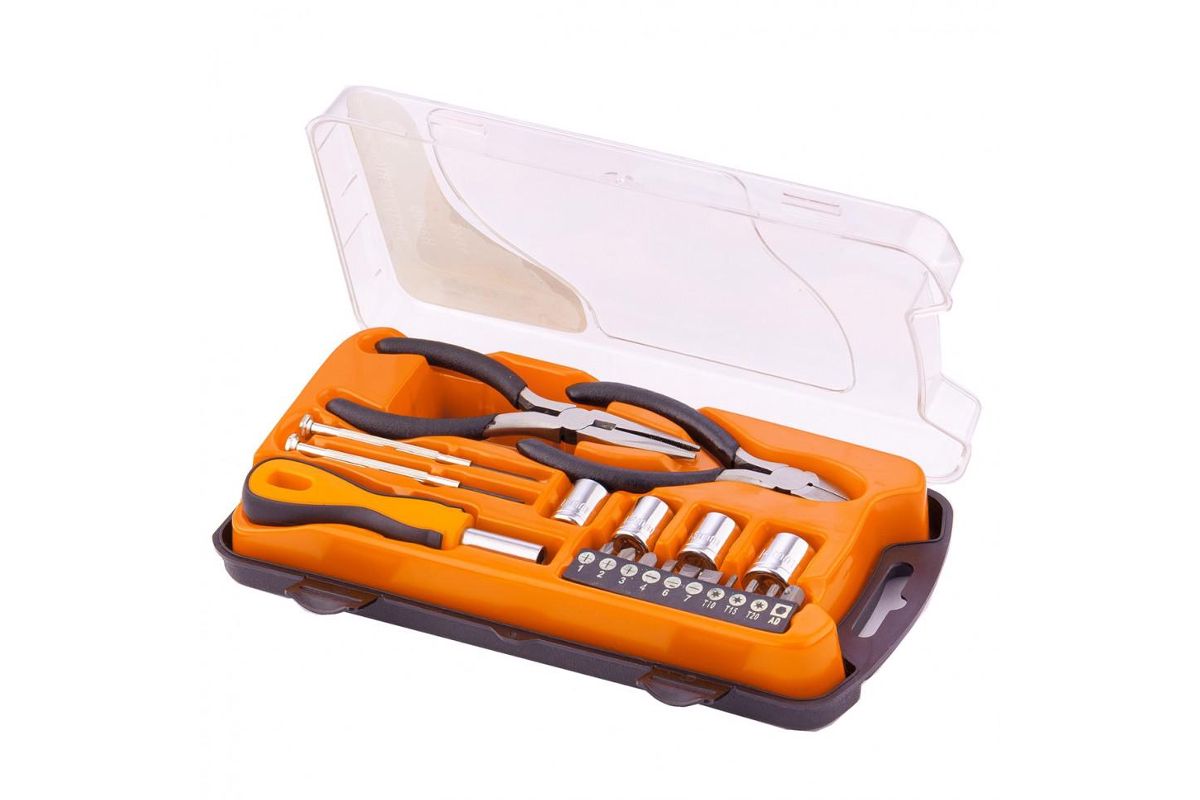 Набор инструментов из 19 предметов. В комплект входят длиногубцы, бокорезы, отвертка, переходник, две часовые отвертки, торцевые головки 11, 12, 13, 14 мм, биты PH 1, PH 2 PZ 1, PZ 2, SL 4, SL 5, SL 6, T 10, T 15, T 20.
