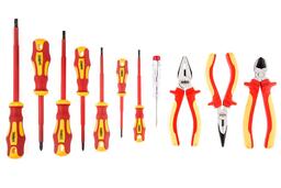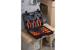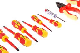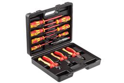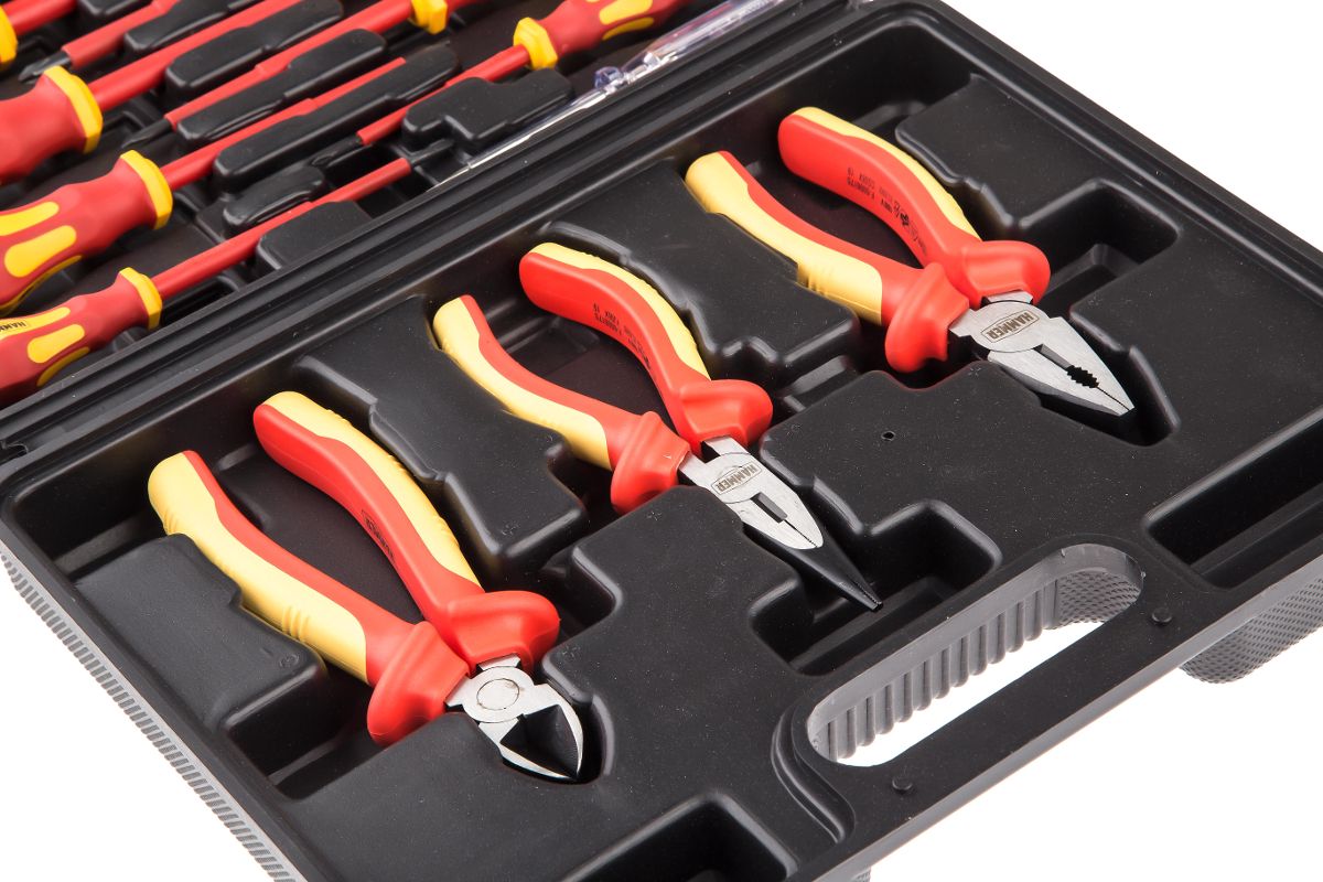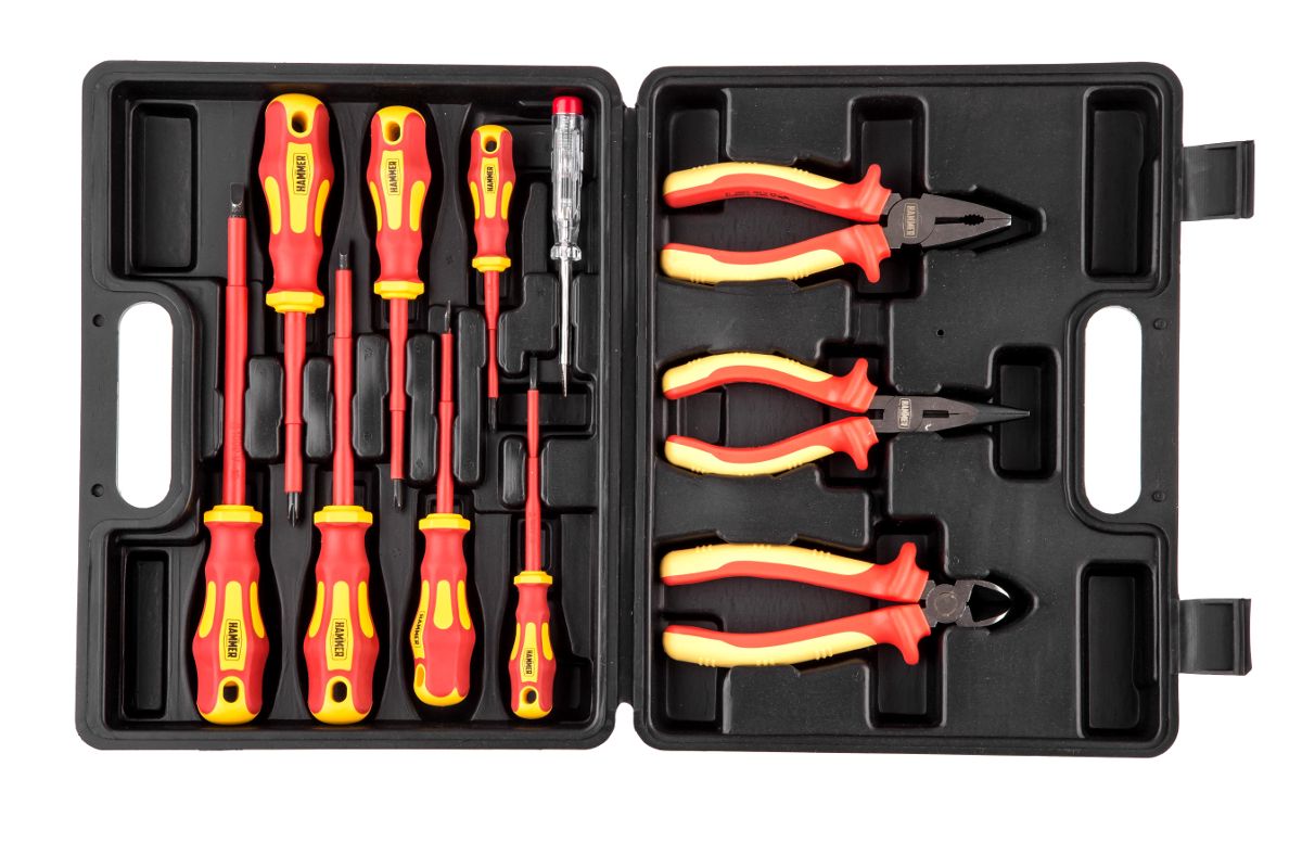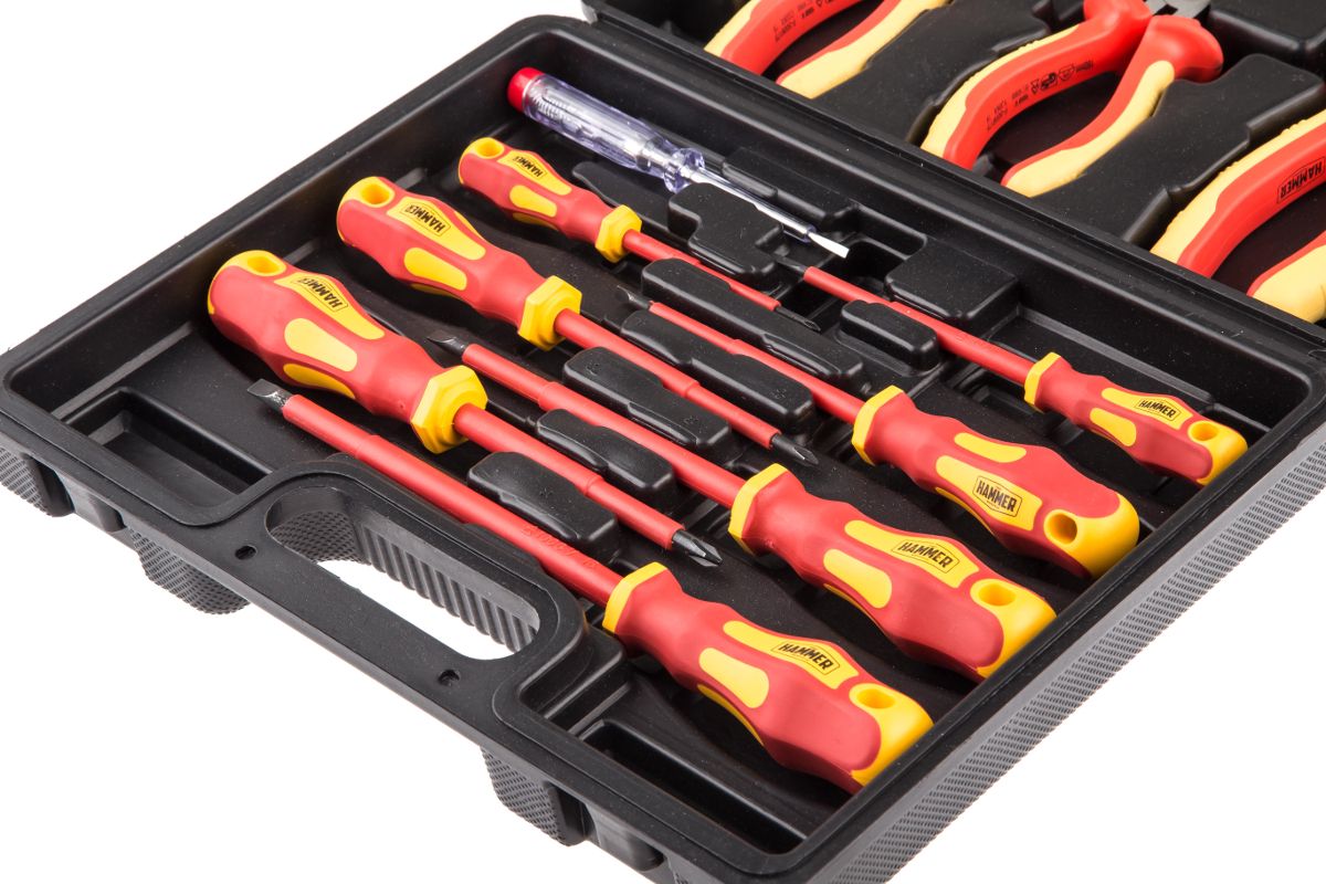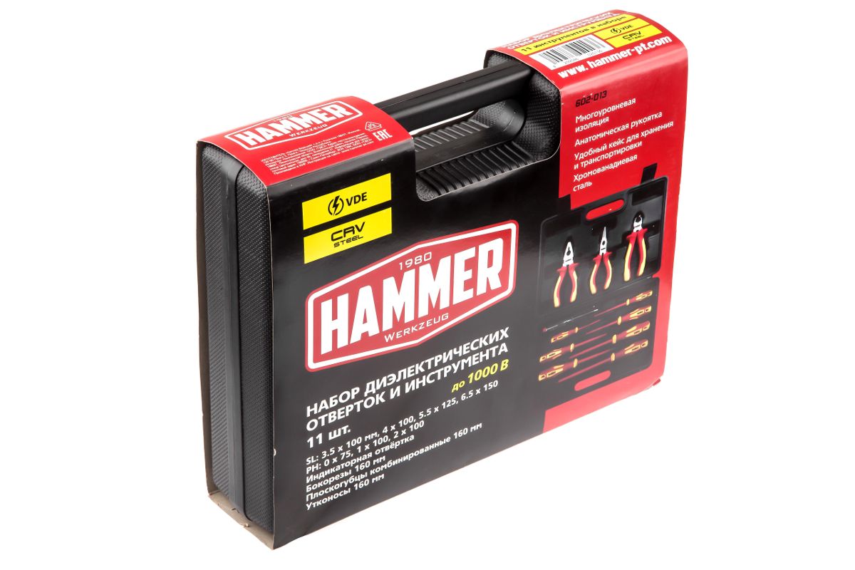 Набор инструментов HAMMER 602-013 пригодится для ремонтных, монтажных и слесарных работ. В наборе 11 предметов: отвертки, бокорезы, плоскогубцы, утконосы и индикаторная отвертка.