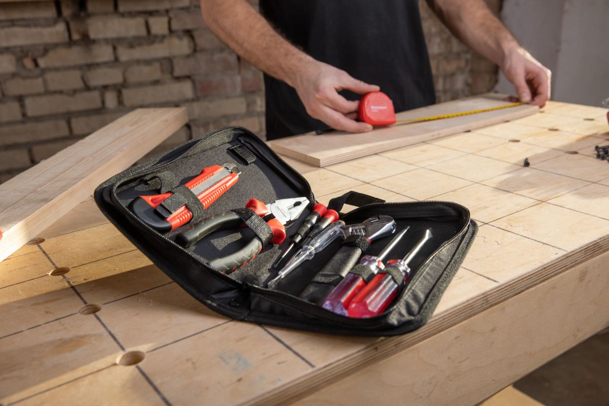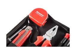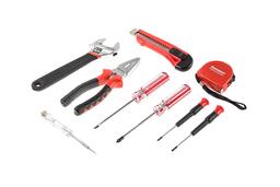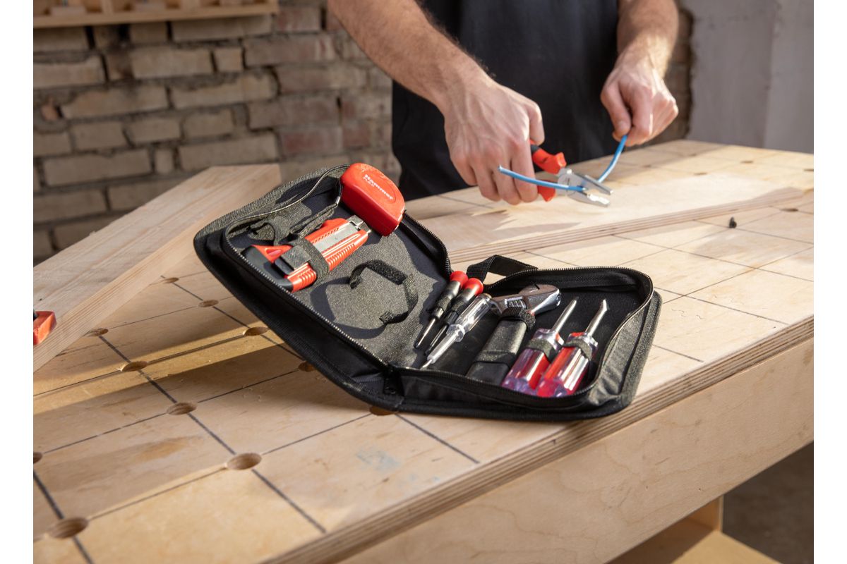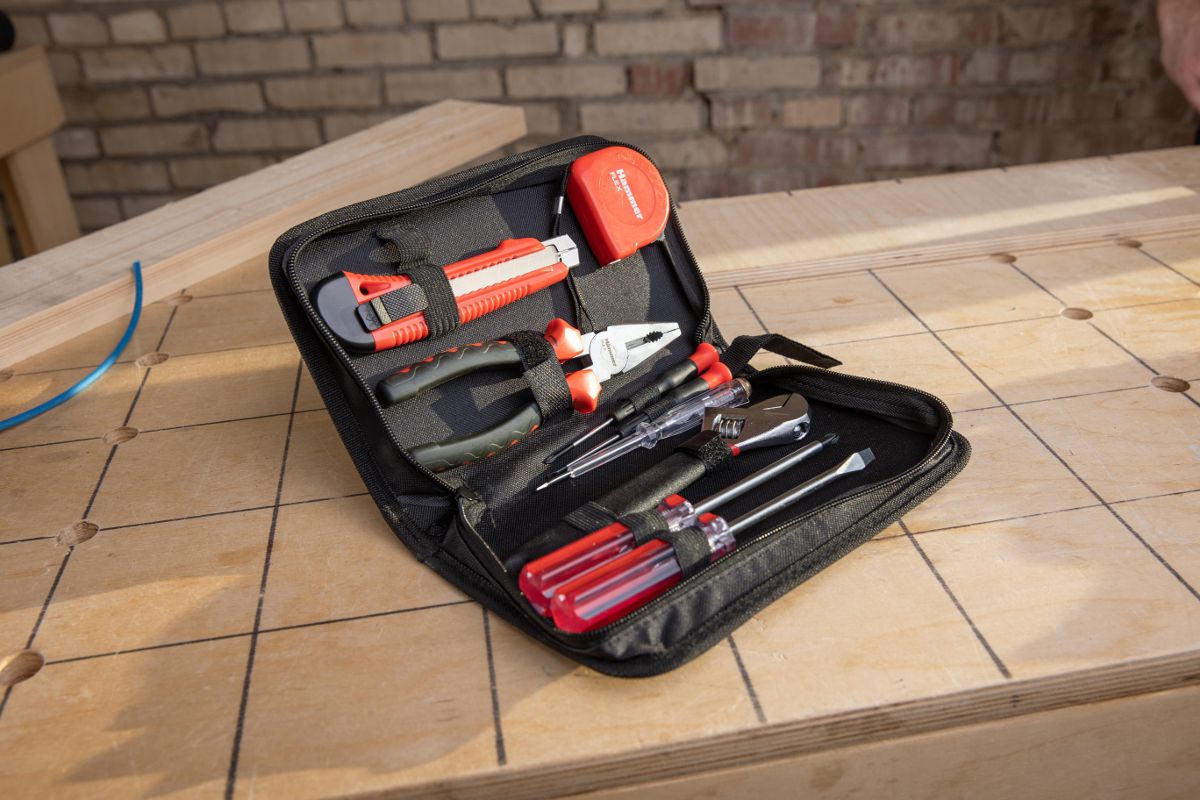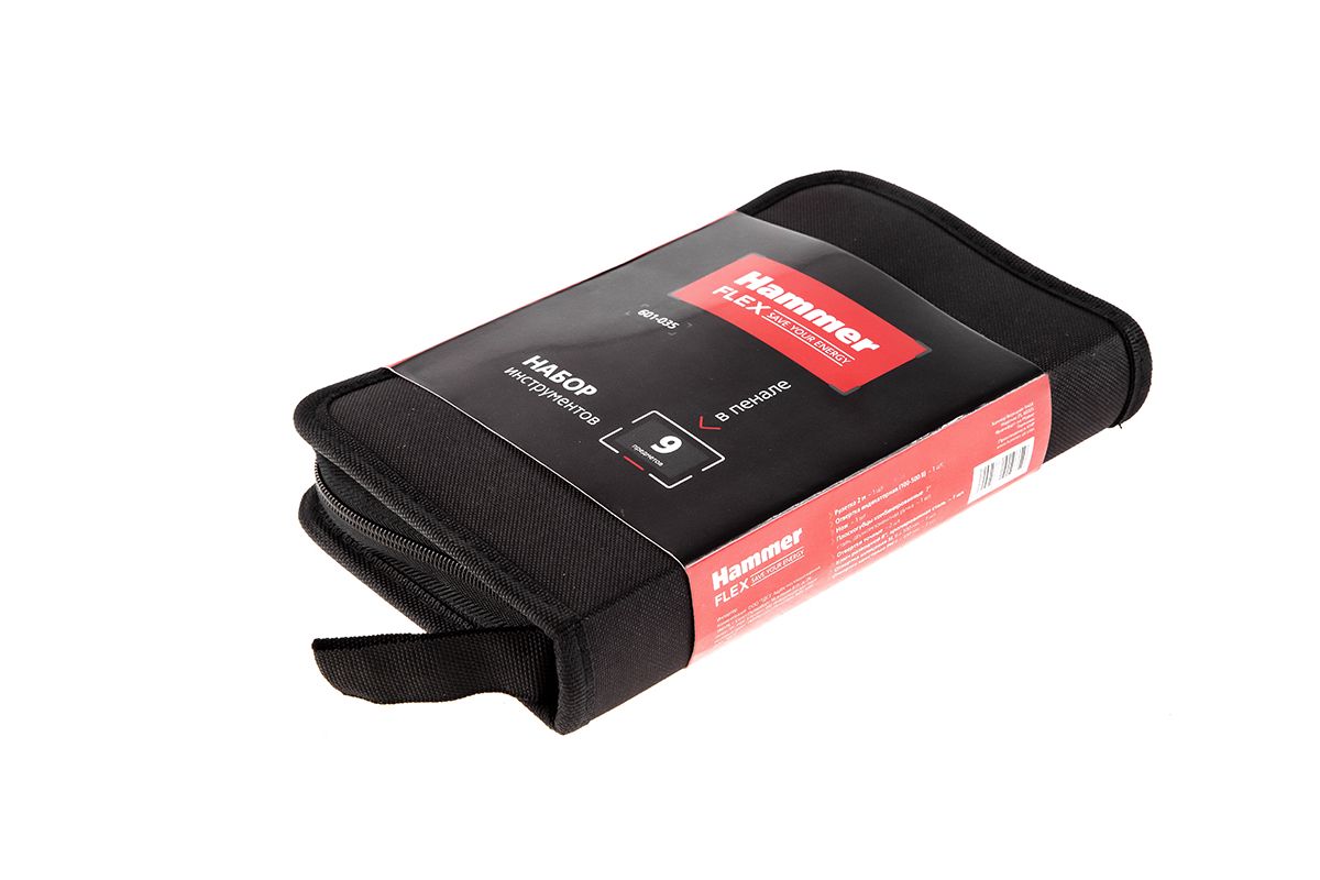 HAMMER 601-035 – набор инструментов для домашнего мастера. Включает нужные в быту инструменты – отвёртки, плоскогубцы, рулетку, нож и т.д. Всего 9 предметов. Подходят для самых частых бытовых задач – сборка и разборка мебели, ремонт ПК, замена розеток и т.п. Поставляется в тканевом пенале.
