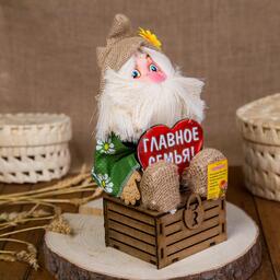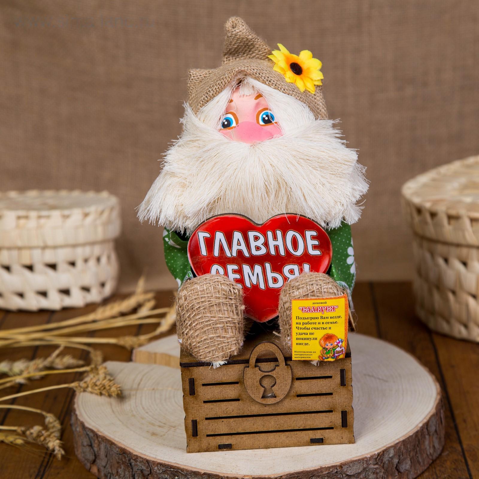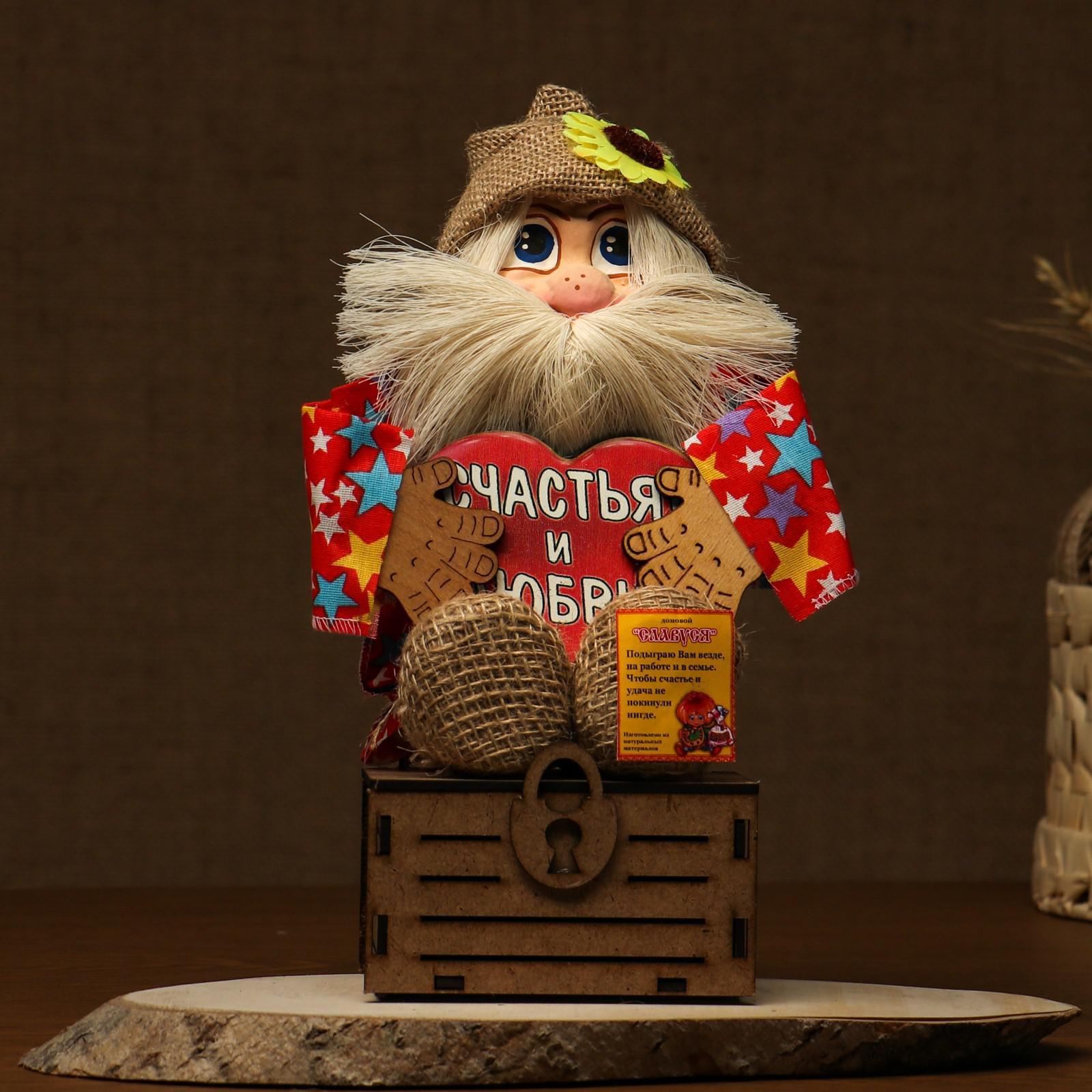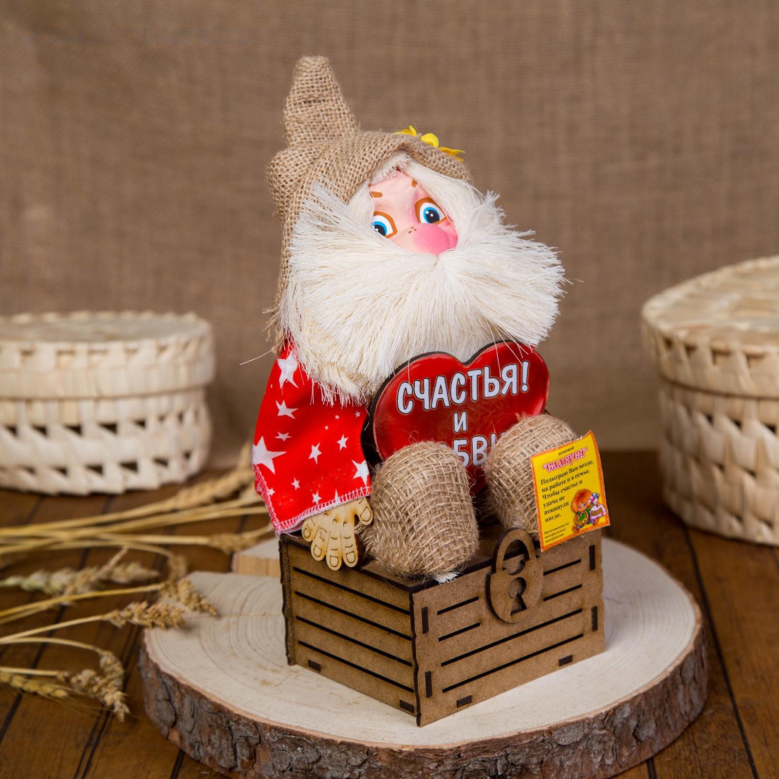 Оберег-домовой "Славуся в льняном колпаке, на сундуке с сердцем", средний, микс