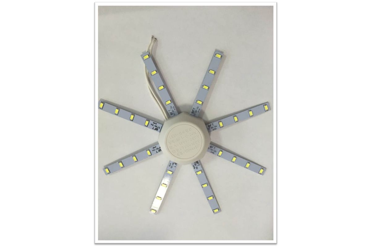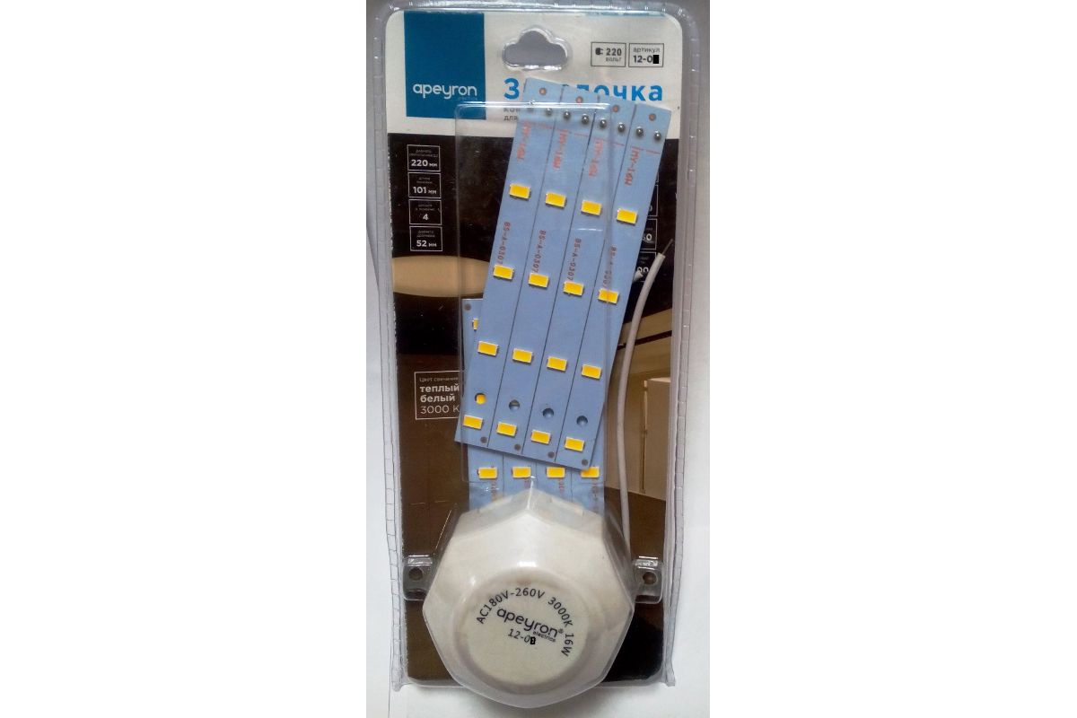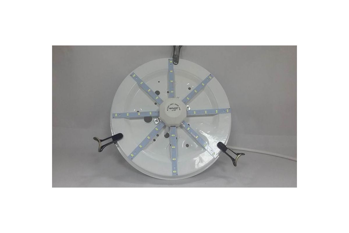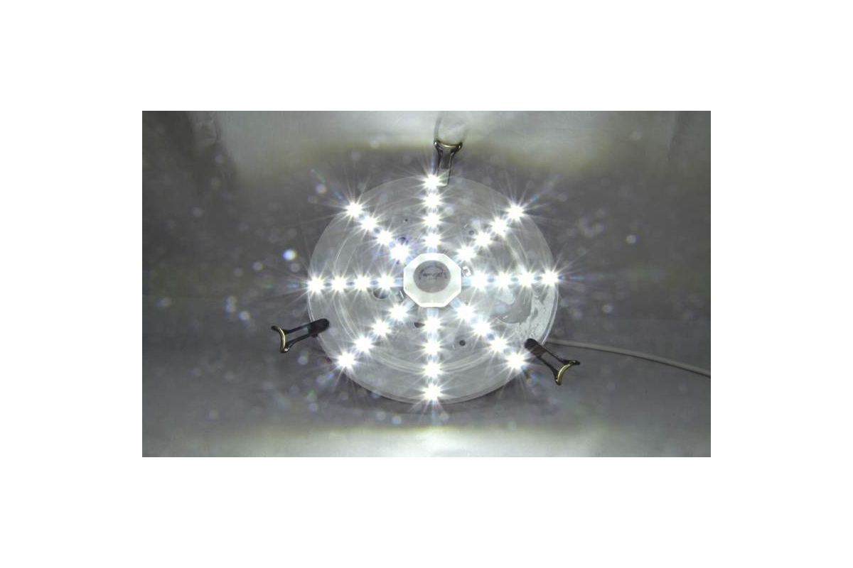 Идеальная замена любых лампочек в настенно-потолочных светильниках. Потребитель всегда сталкивается с проблемой неравномерности свечения светильника при использовании в настенно-потолочных светильниках в качестве источника света ламп: накаливания, КЛЛ, энергосберегающей, светодиодной. Лампы дают яркое пятно засвета, в то время как остальная часть светильника остается темной. Данный комплект полностью решает проблему затемнений и гарантирует равномерный засвет по всей поверхности рассеивателя. «Звёздочка» крепится к металлическому основанию светильника на магнитах, которые располагаются на обратной стороне блока питания. Также в комплект входит монтажная планка с отверстиями для крепления к пластиковым и иным основаниям. Комплект универсален и подходит для большинства оснований настенно-потолочных светильников.
