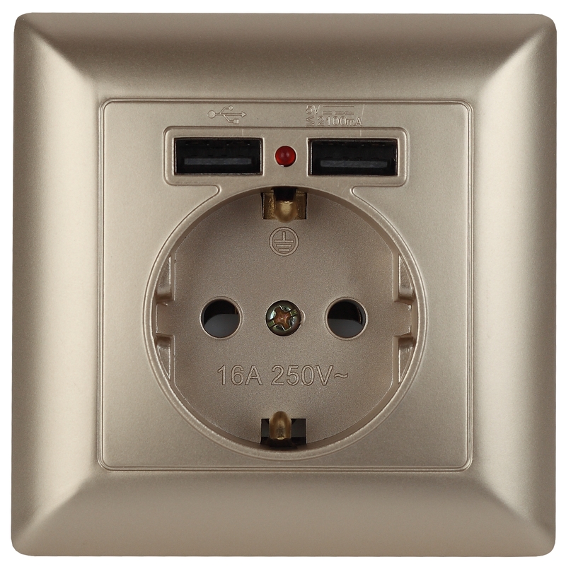 Розетка с USB со шторкой серии Intro Solo скрытой установки цвет шампань 4-410-04. Номинальные характеристики 16А 250В/2,1А-5В . Розетка выполнена из негорючего термопласта, укомплектована одноместной рамкой, оснащена винтовыми клеммами. Клеммы с двумя отверстиями позволяют соединять соседние розетки шлейфом. Установка в подрозетник производится как на монтажные лапки, так и на винты.