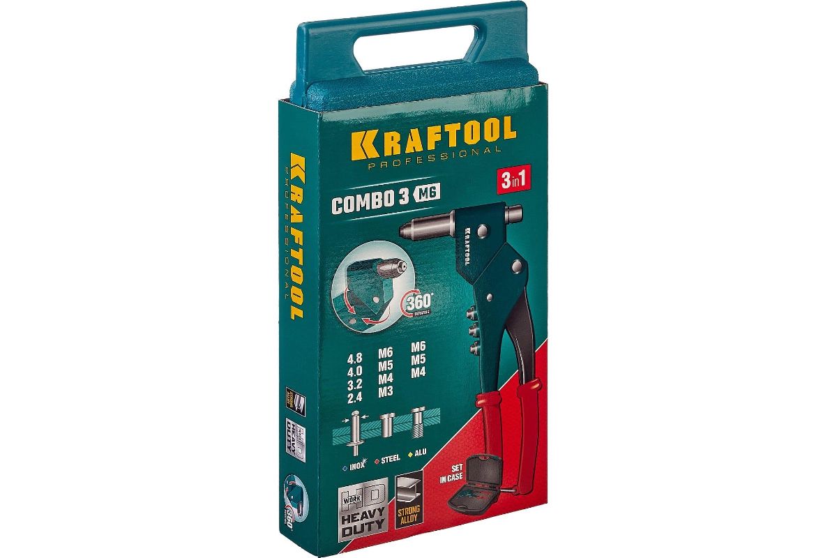Заклепочник поворотный Kraftool ''Combo3-M6'' в кейсе резьбовые М3-М6, вытяжные 2.4-4. мм, штифты М4-