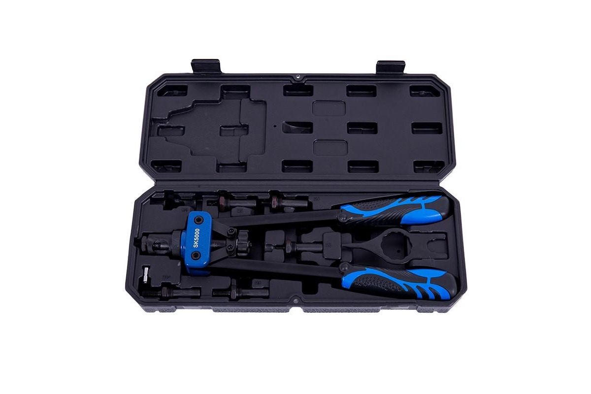 Заклепочник механический Absolut (SKytools) SK5000 для установки резьбовых заклепок диаметром от М3 до М10 из алюминия и стали. Поставляется в пластиковом кейсе, который обеспечит надежное хранение инструмента и комплектность оснастки.