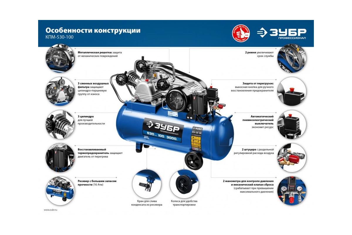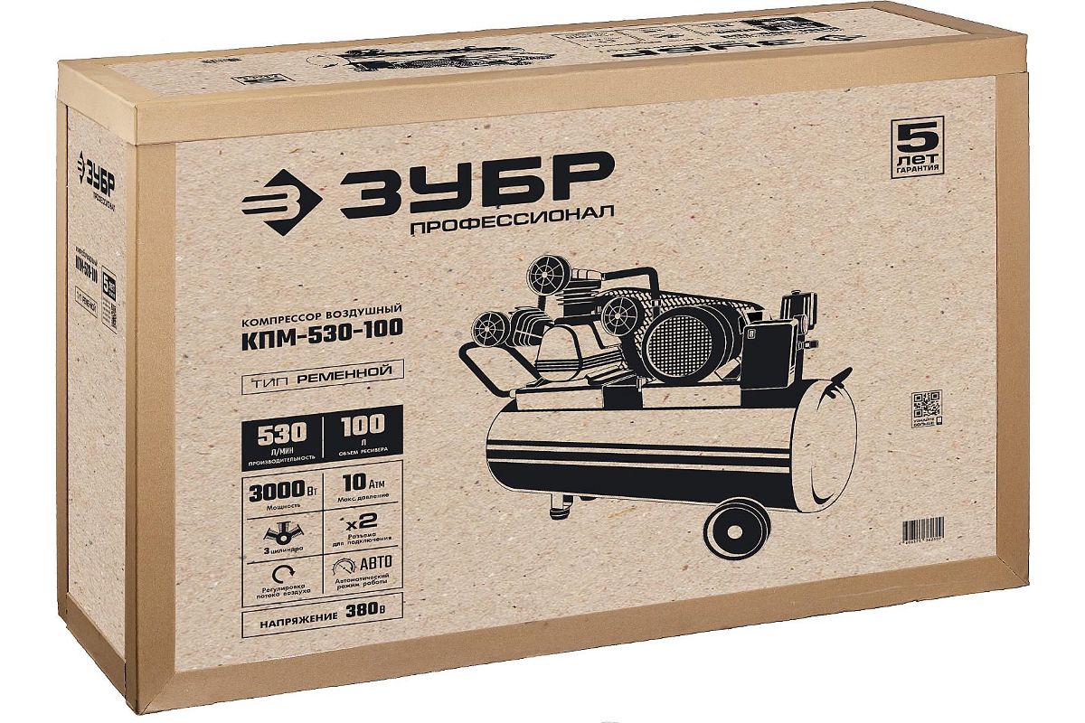 Компрессор ЗУБР КПМ-530-100 ременной 380 В, 530 л/мин, 100 л, 3000 Вт
