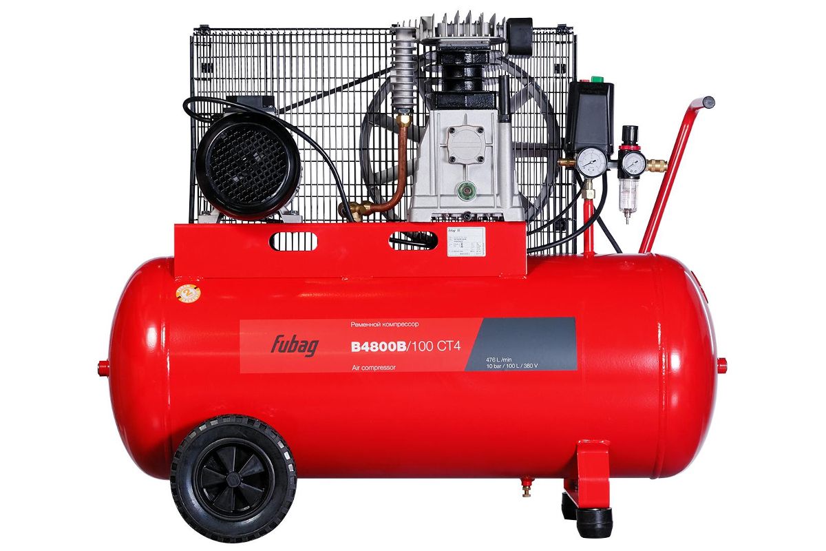 FUBAG B4800B/100 CT4 – профессиональный трёхфазный компрессор с ременным приводом для обеспечения воздухом пневматических инструментов. Применяется на строительной площадке, в мастерской или автосервисе. Мощности двигателя в 3000 Вт достаточно для перегонки 480 л воздуха в минуту под давлением до 10 бар. Подходит для работы с гайковёртами, шлифмашинками, дрелями, краскопультами и т.д. Ресивер на 100 л позволяет реже включать двигатель для подкачки воздуха.