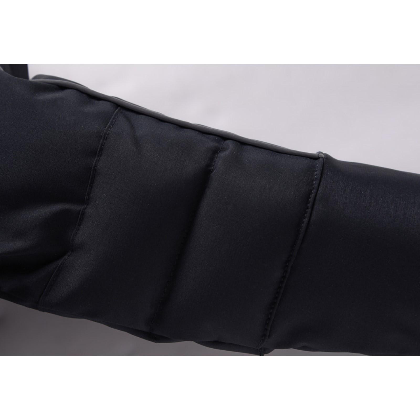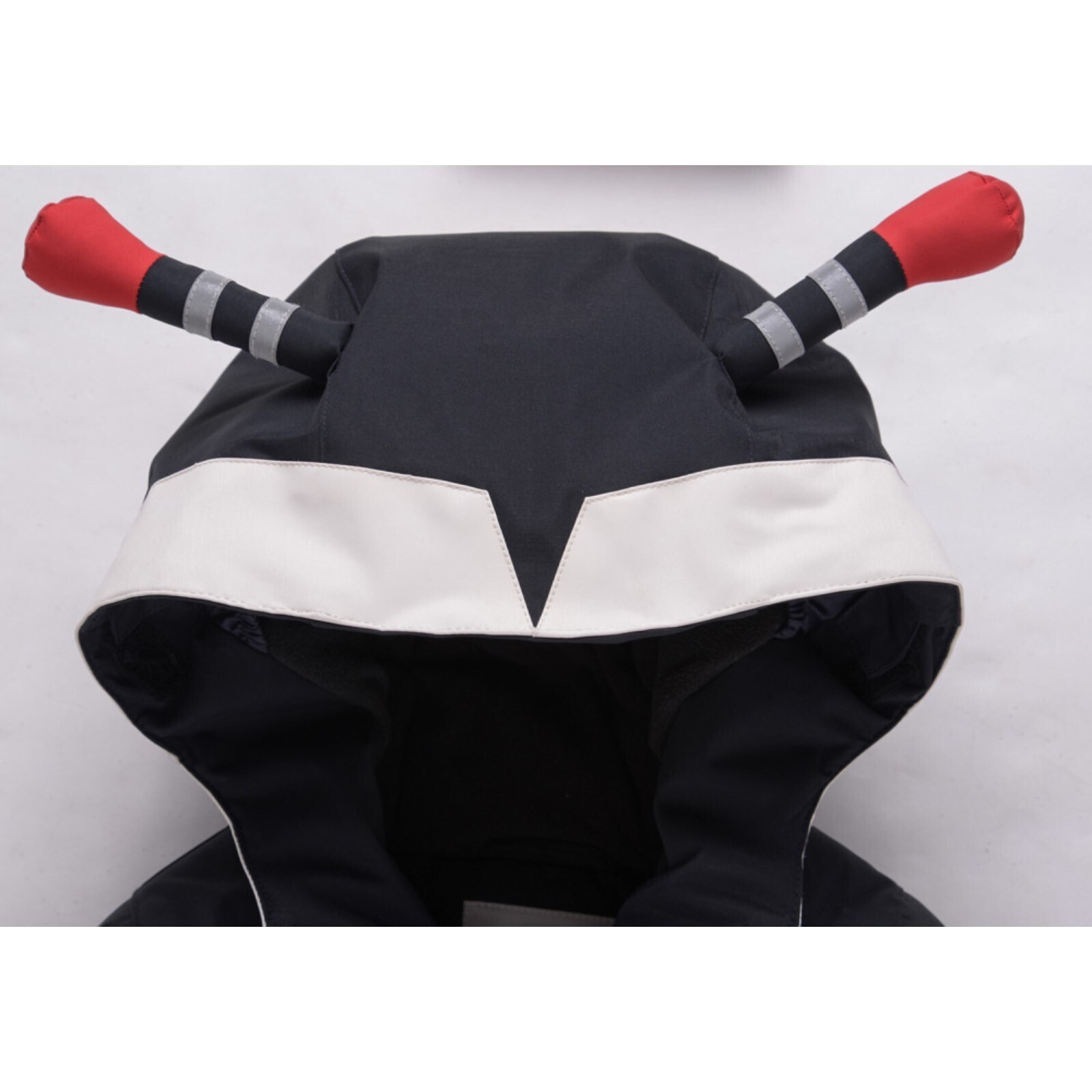 Съёмный капюшон на кнопках с боковыми резинками и манжеты рукавов на резинке.