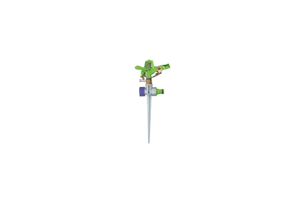 Распылитель импульсный изготовлен из латуни. Оснащен механизмом регулировки угла горизонтального распыления струи от 30° до 360°. Радиус распыления до 13 м. Конструкция позволяет создать сеть одновременно работающих распылителей. Используется в приусадебных поливочных системах
