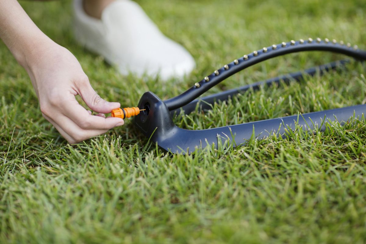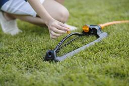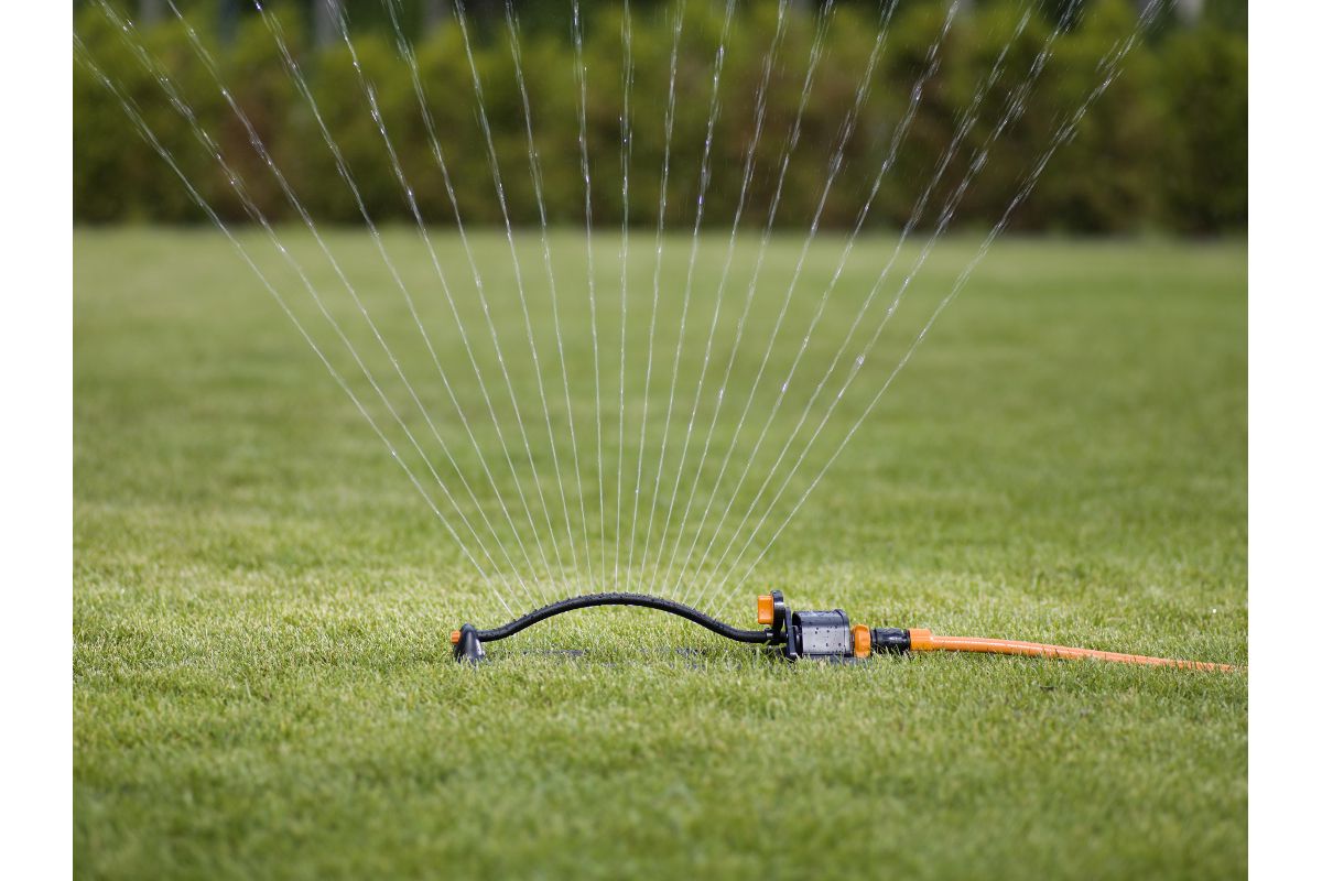 Осциллирующий дождеватель отлично подходит для полива больших по размеру участков газона. Благодаря переключателю легко регулировать ширину зоны полива.