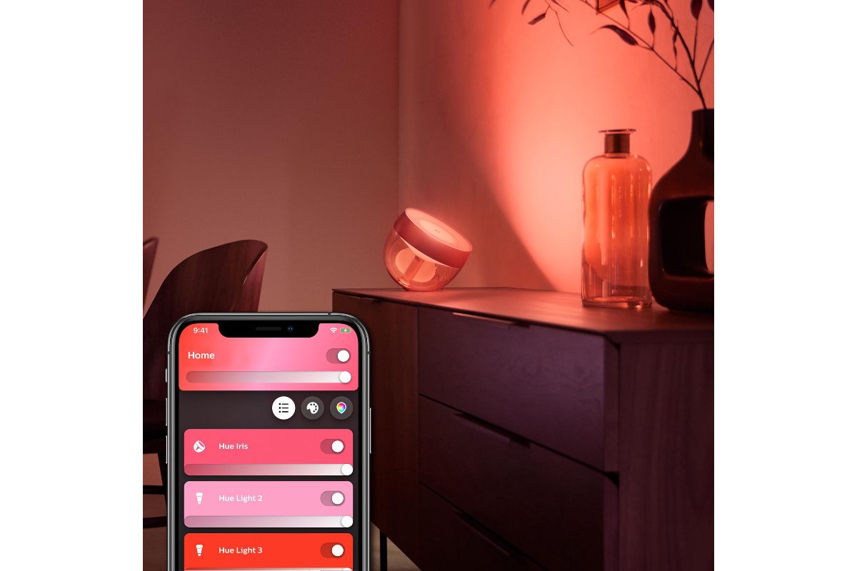 - Благодаря своему уникальному стилю акцентныи? светильник Philips Hue Iris станет прекрасным дополнением для любого интерьера. Его можно расположить в любом месте дома и наслаждаться цветнои? подсветкои? стен в гостинои? или мягким светом ночника в спальне;
