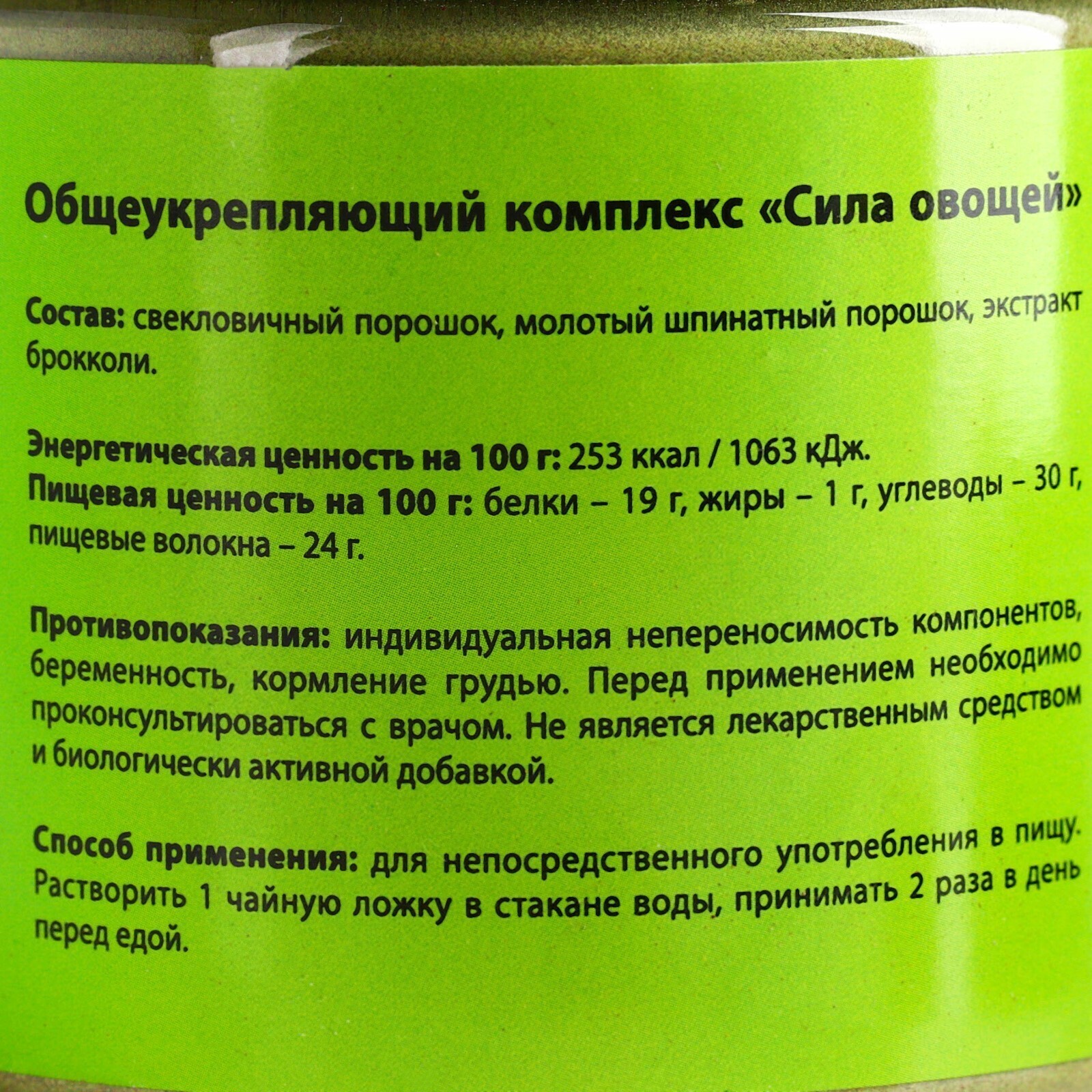 Состав: свекловичный порошок, молотый шпинатный порошок, экстракт брокколи.