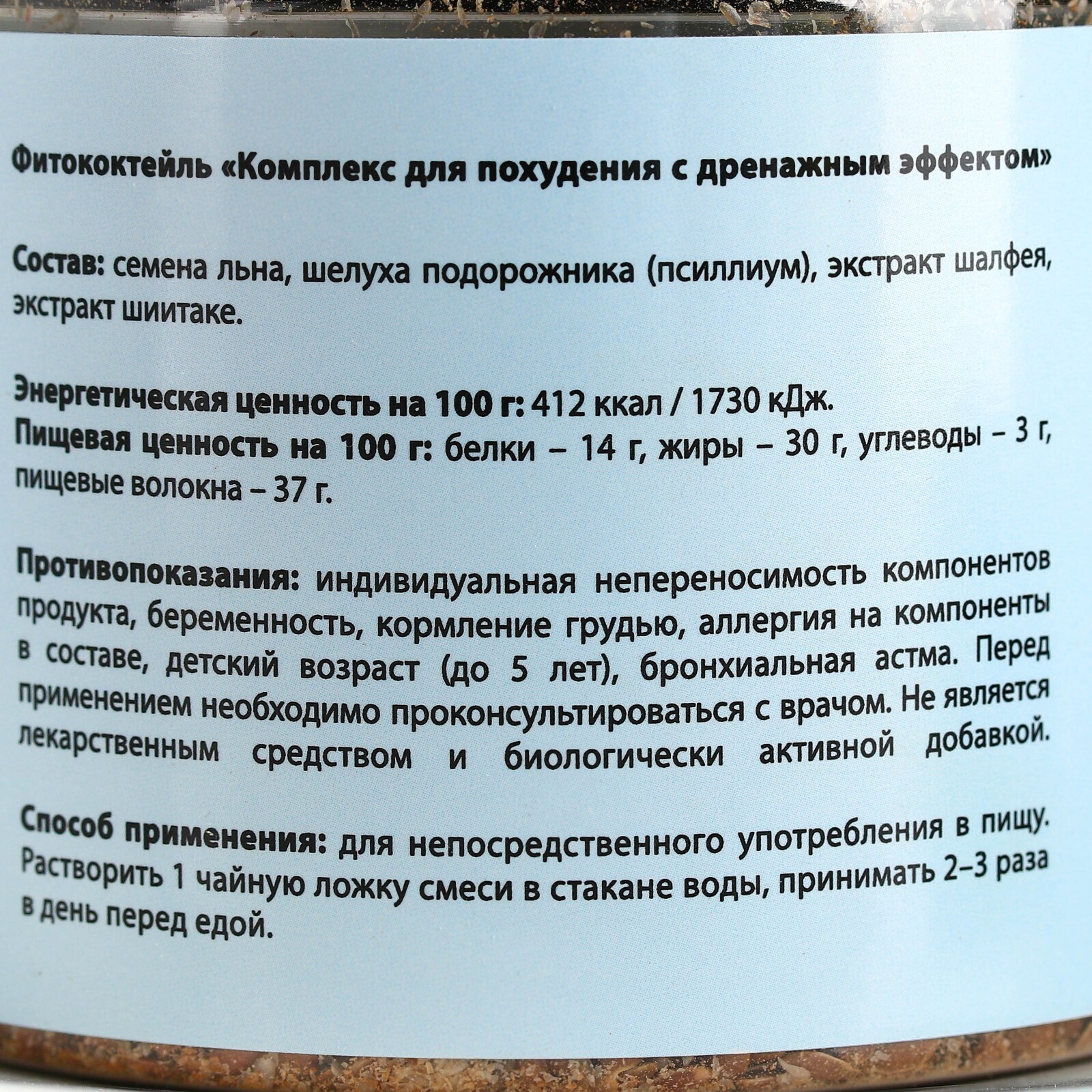 Способ применения: для непосредственного употребления в пищу. Растворить 1 чайную ложку смеси в стакане воды, принимать 2–3 раза в день перед едой.
