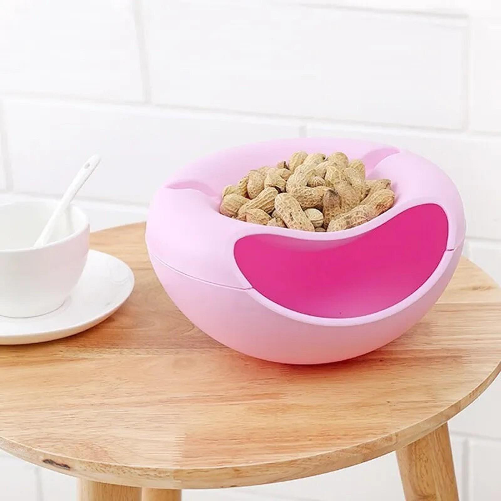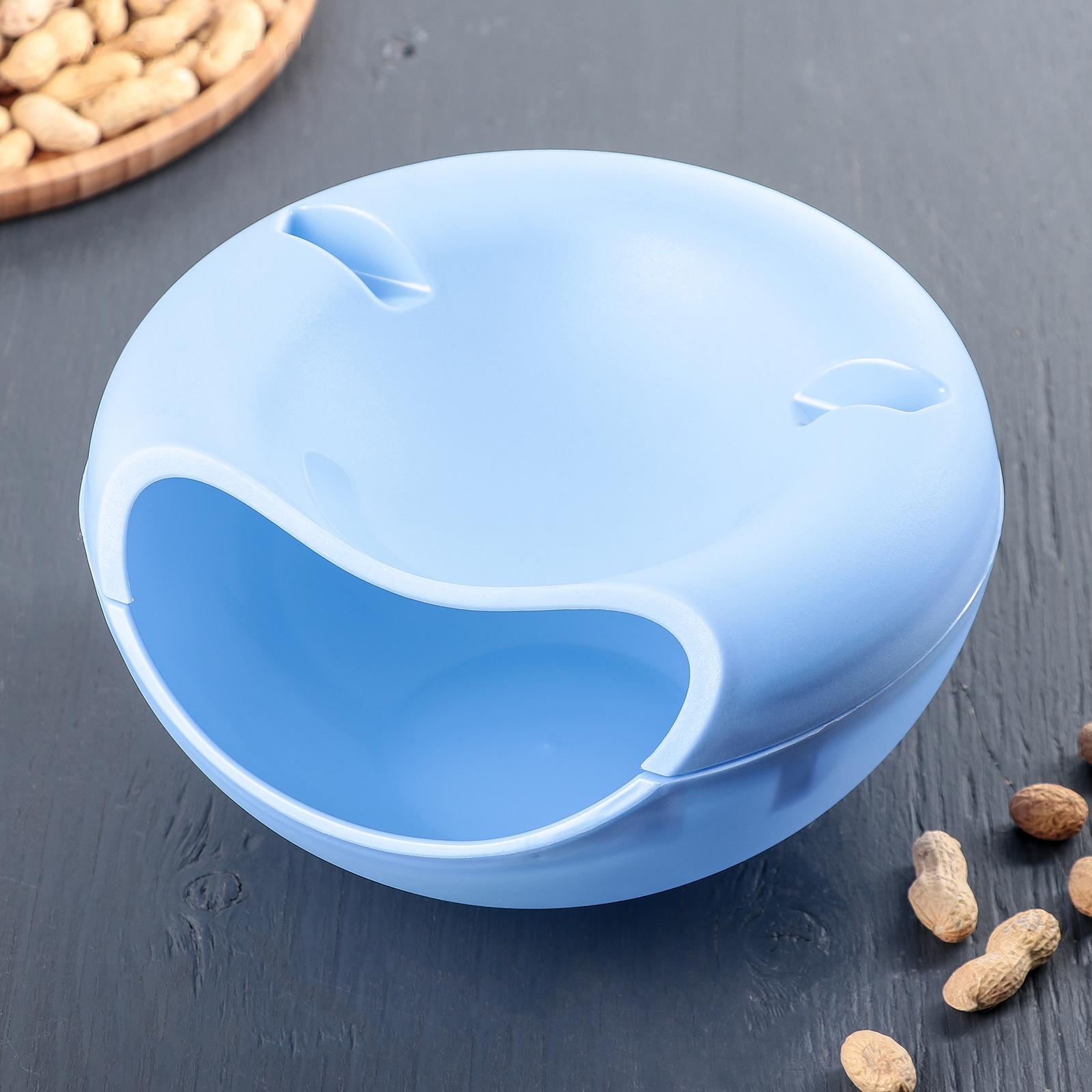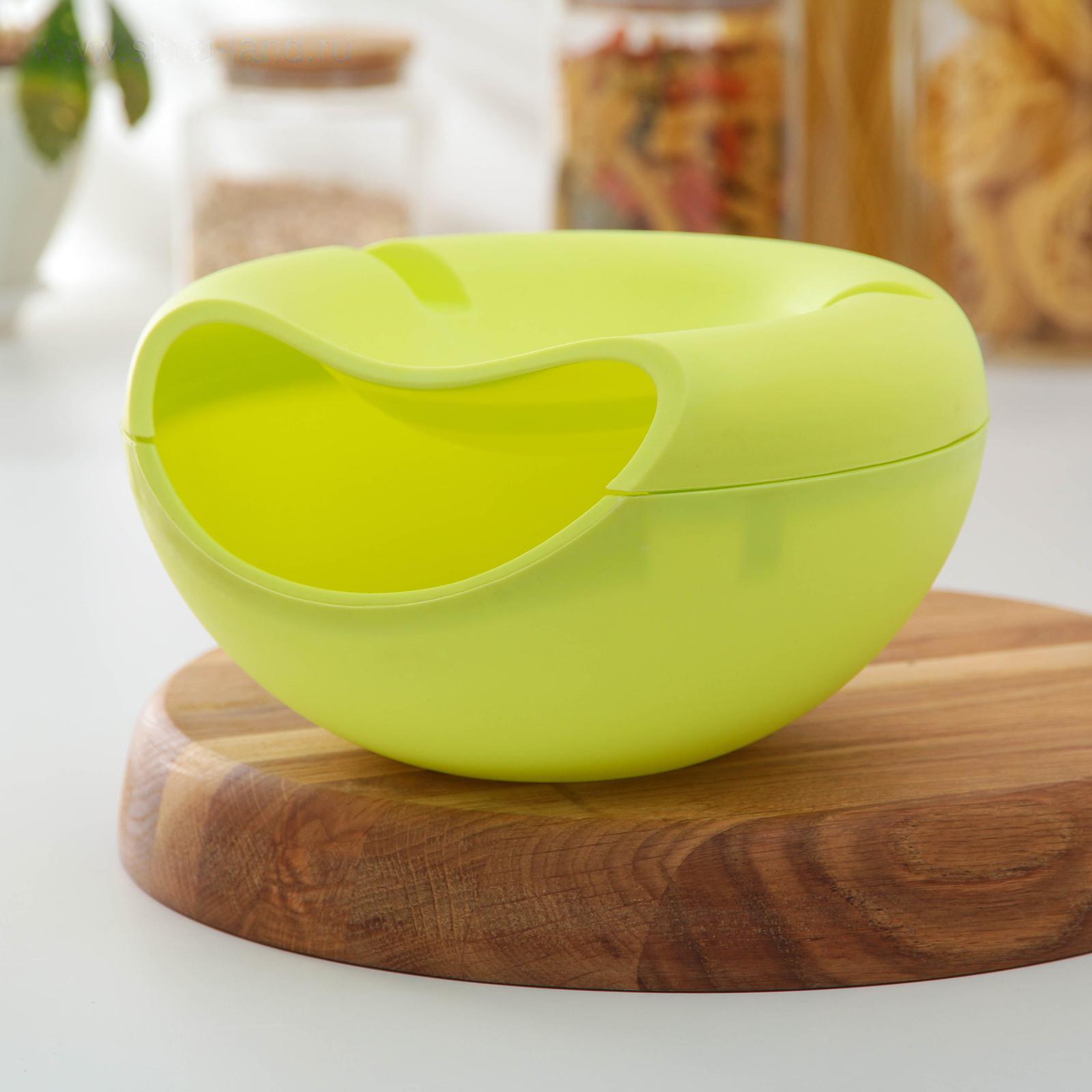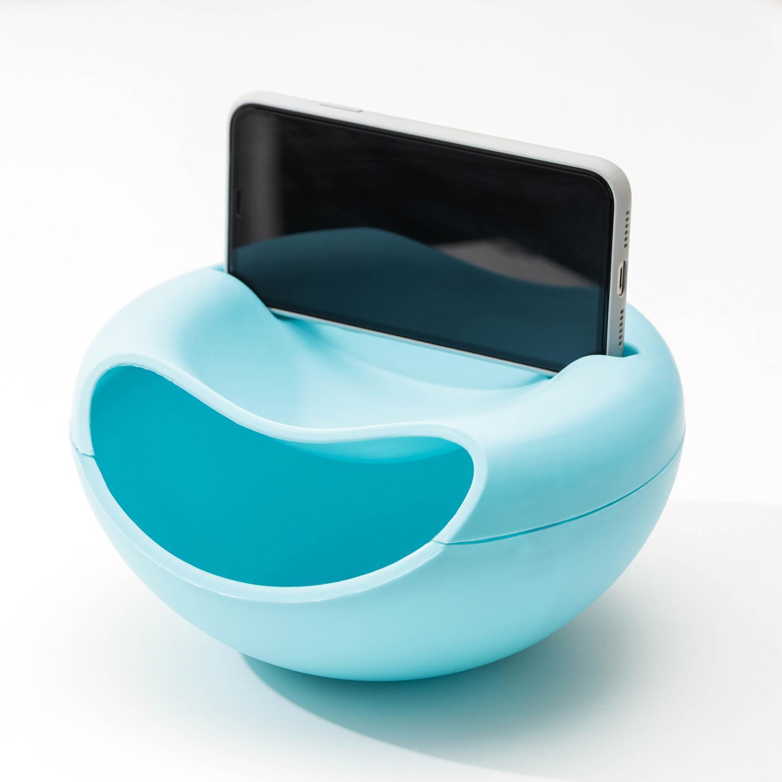 Удобная тарелка-подставка пригодится во время просмотра фильма или сериала на смартфоне. Верхнюю ёмкость можно наполнить закусками — семечками, орешками, чипсами или конфетами, а в нижний отсек складывать шелуху и мусор. В удобных пазах телефон будет держаться устойчиво.