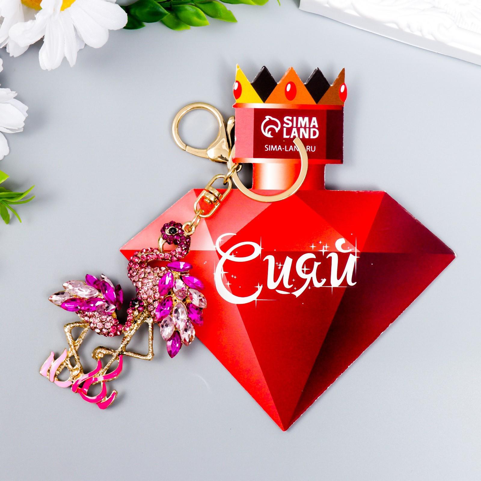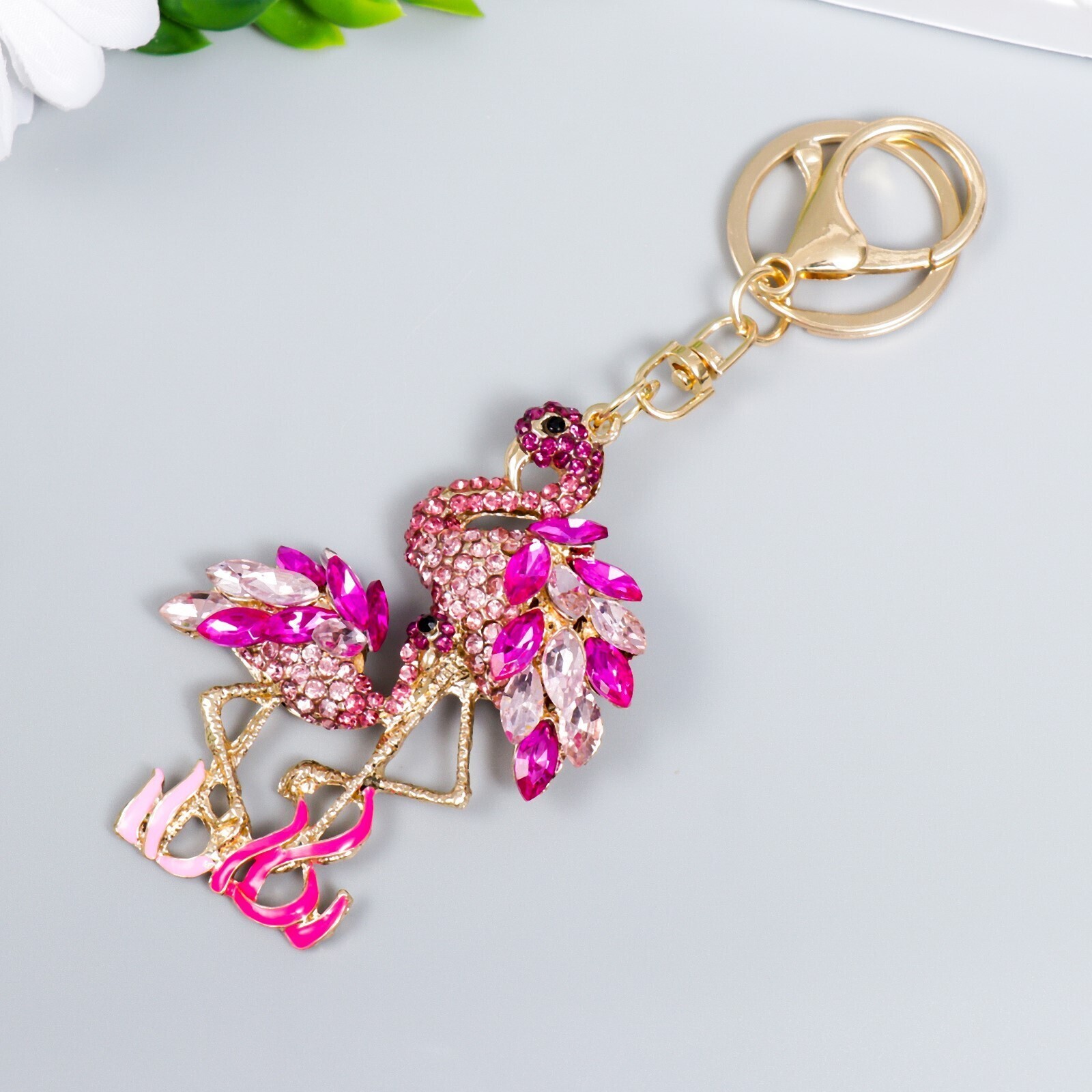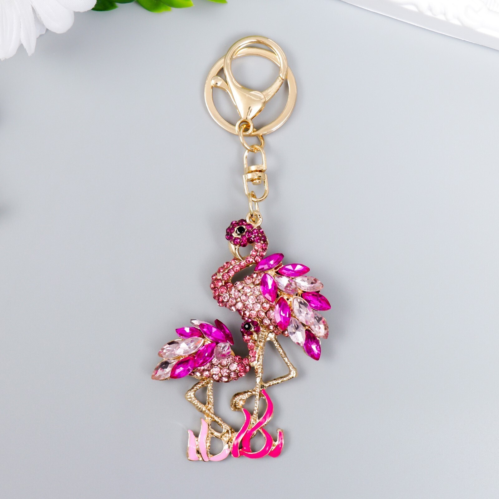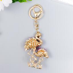 Брелок металл с карабином, эмаль, стразы "Два фламинго" розовый 14,5х4,1 см