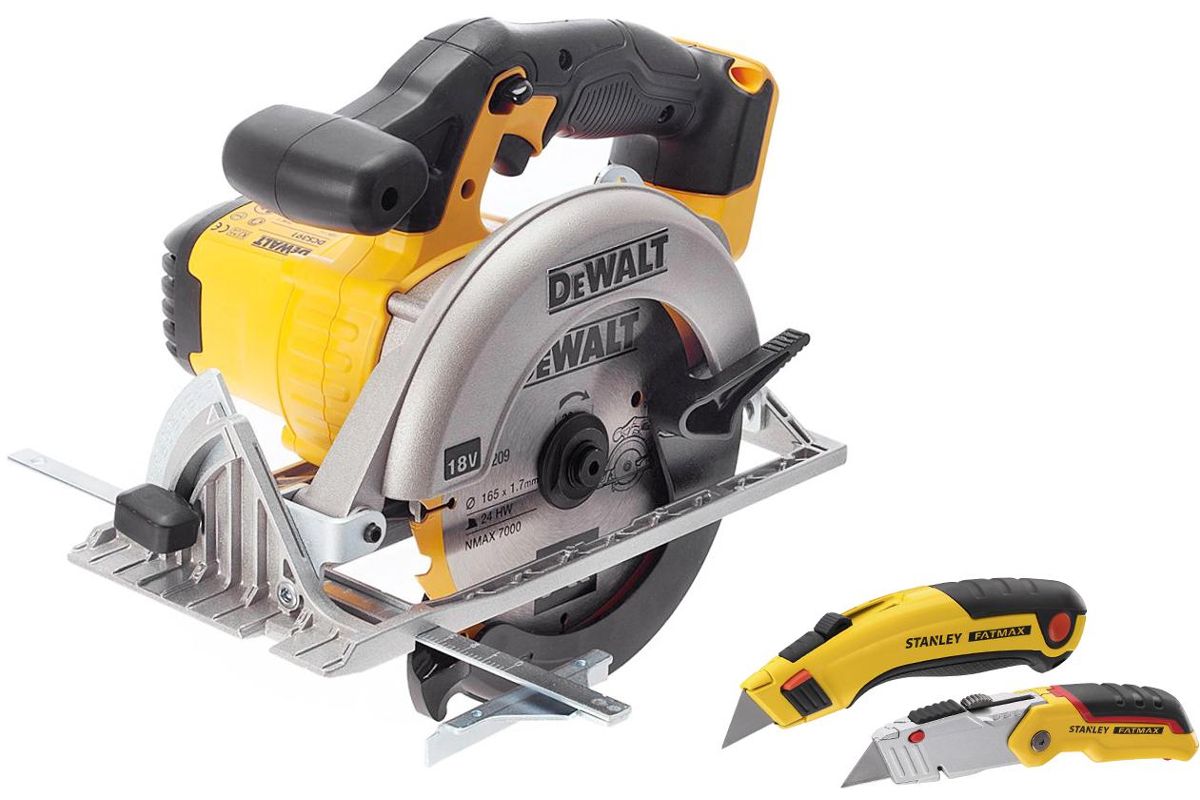 В состав набора входят: Пила циркулярная DEWALT DCS391N-XJ 18.0 в xr 460Вт 3700 об/мин диск 165мм пропил 55мм без акк и зу, Набор из 2х ножей Stanley FatMax FMHT82836-0
