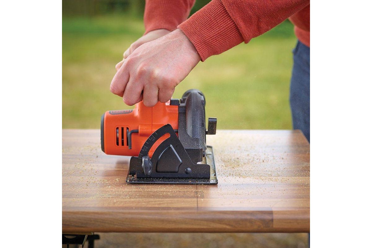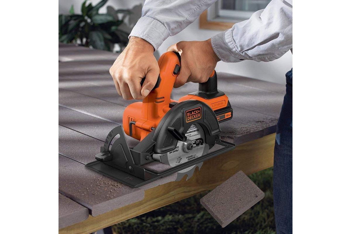 BLACK+DECKER BDCCS18 – циркулярная аккумуляторная пила с диском 140 мм. Справляется с распиловкой дерева и композитных материалов толщиной до 43 мм. Будет полезна для работы в домашней мастерской. Поставляется без аккумулятора и зарядного устройства в комплекте.