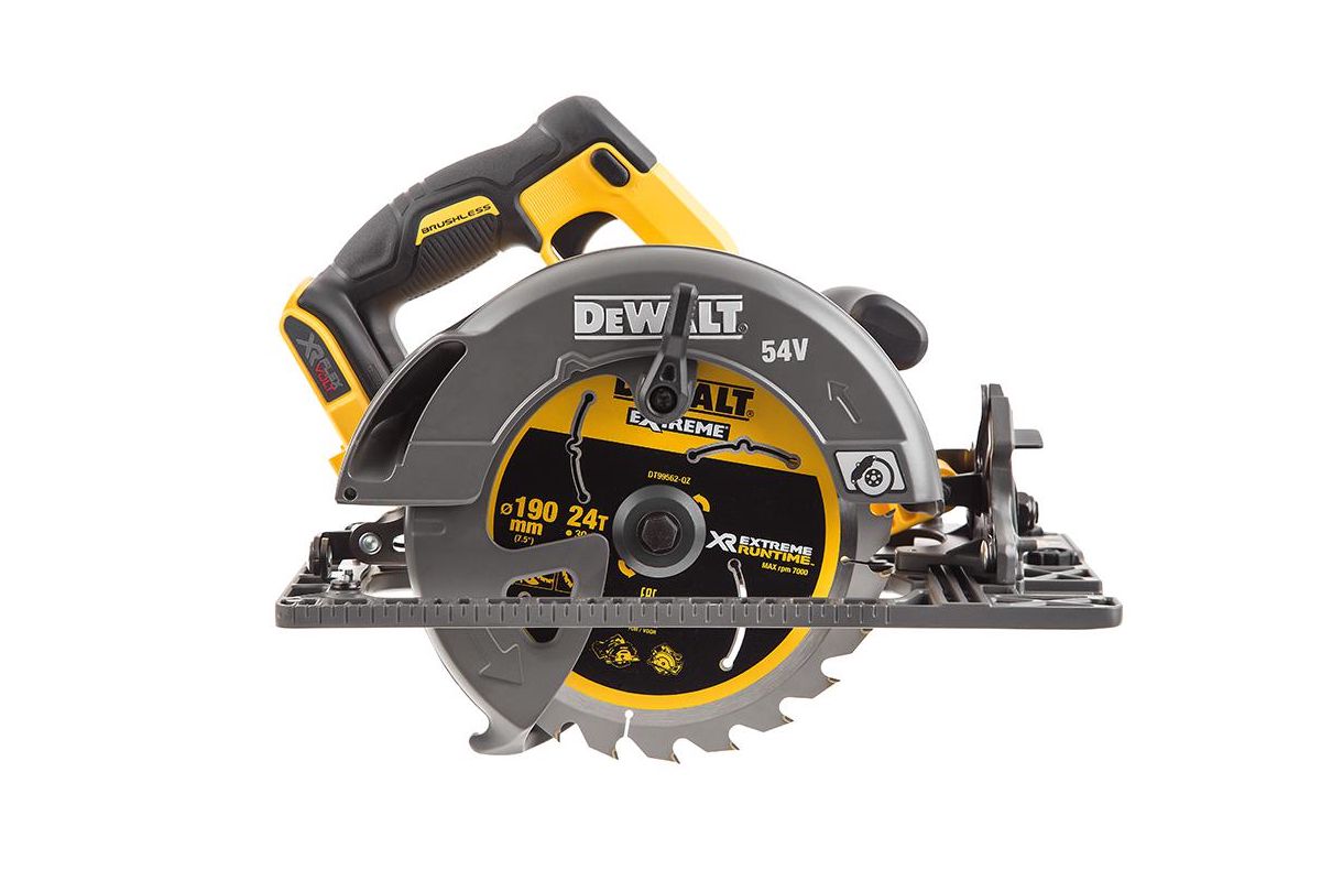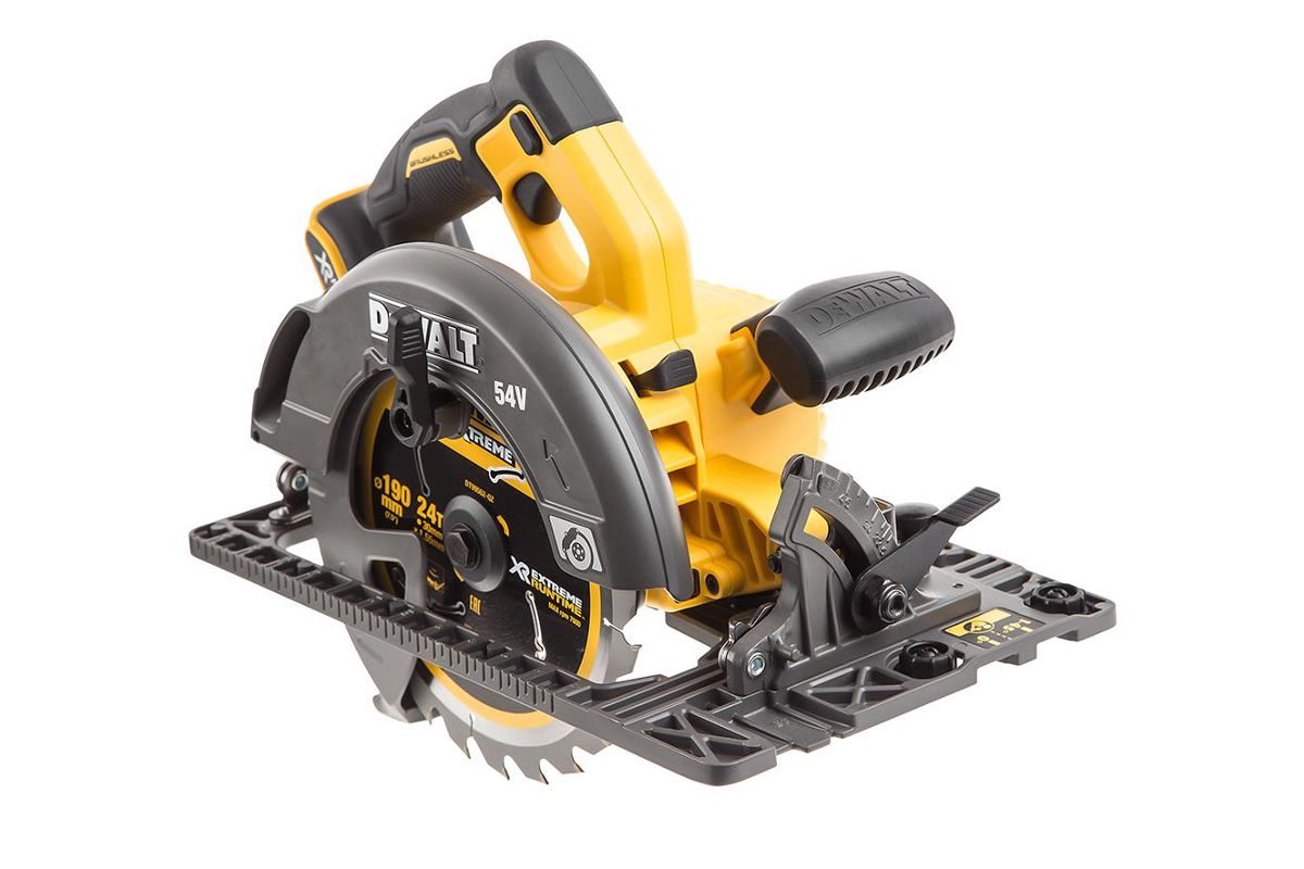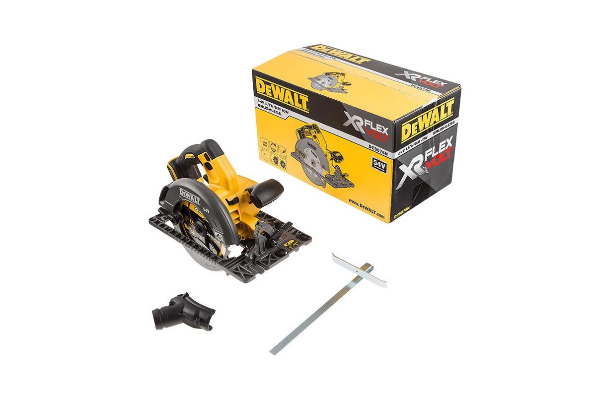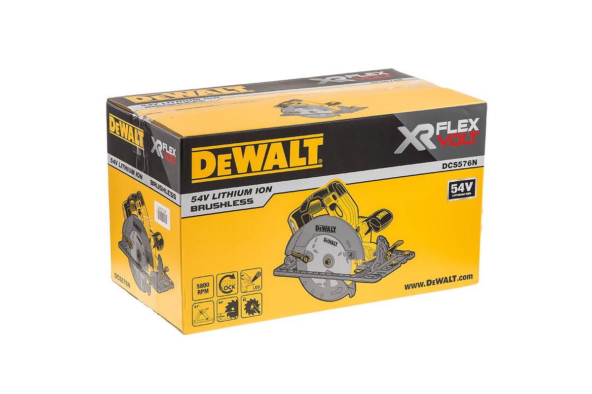 Аккумуляторная циркулярная пила DEWALT DCS576N-XJ 54 В XR FLEXVOLT - одна из самых мощных в своем классе. Питание от Li-Ion аккумулятора на 54 В. Максимальная скорость 5800 об/мин. Наружный диаметр диска - 190 мм. Глубина пропила – 61 мм.